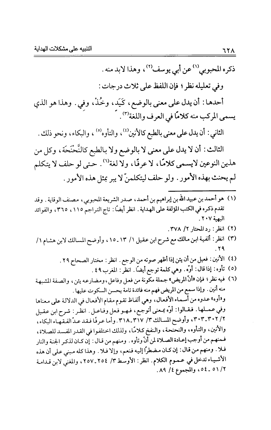 الثالث: أن لا يدل على معنى لا بالوضع ولا بالطبع كالنحنحة، وكل من هذين النوعين لا يسمى كلامًا، لا عرفًا، ولا لغة. حتى لو حلف لا يتكلم لم يحنث بهذه الأمور. ولو حلف ليتكلمن لا يبر بمثل هذه الأمور.