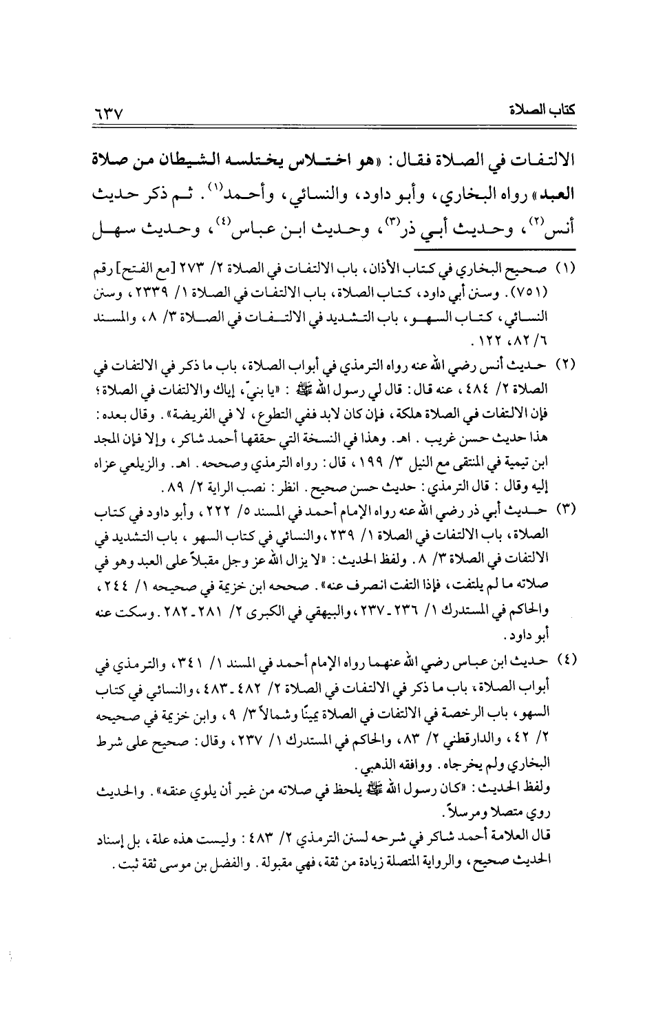 الالتفات في الصلاة فقال: ((هو اختلاس يختلسه الشيطان من صلاة العبد)) رواه البخاري، وأبو داود، والنسائي، وأحمد. ثم ذكر حديث أنس، وحديث أبي ذر، وحديث ابن عباس، وحديث سهل