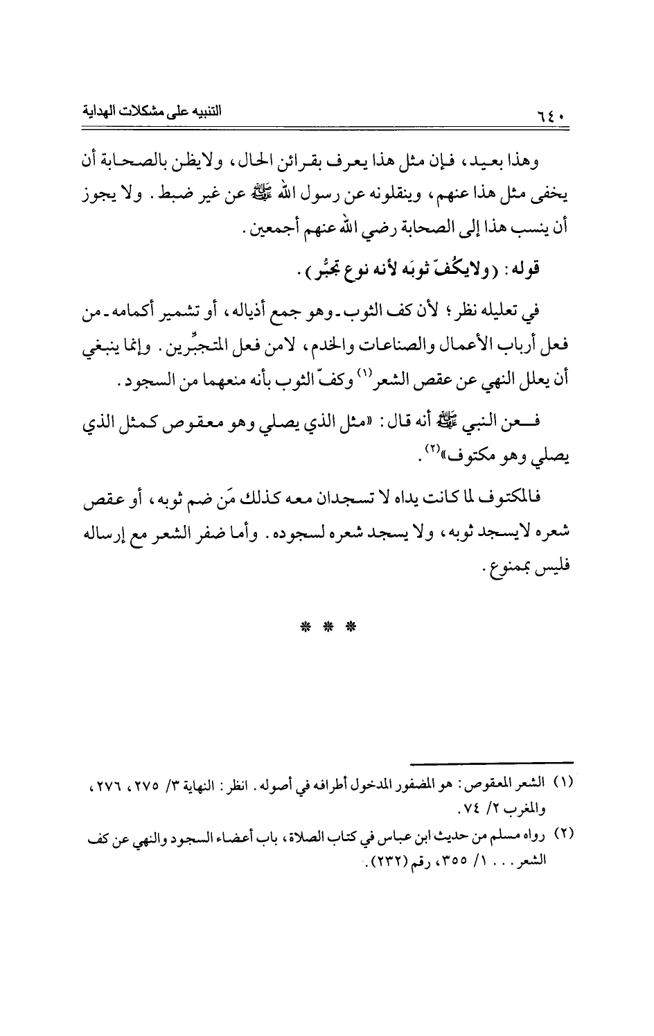 في تعليله نظر؛ لأنه كف الثوب -وهو جمع أذياله، أو تشمير أكمامه -من فعل أرباب الأعمال والصناعات والخدم، لا من فعل المتجبرين. وإنما ينبغي أن يعلل النهي عن عقص الشعر وكف الثوب بأنه منعهما من السجود.