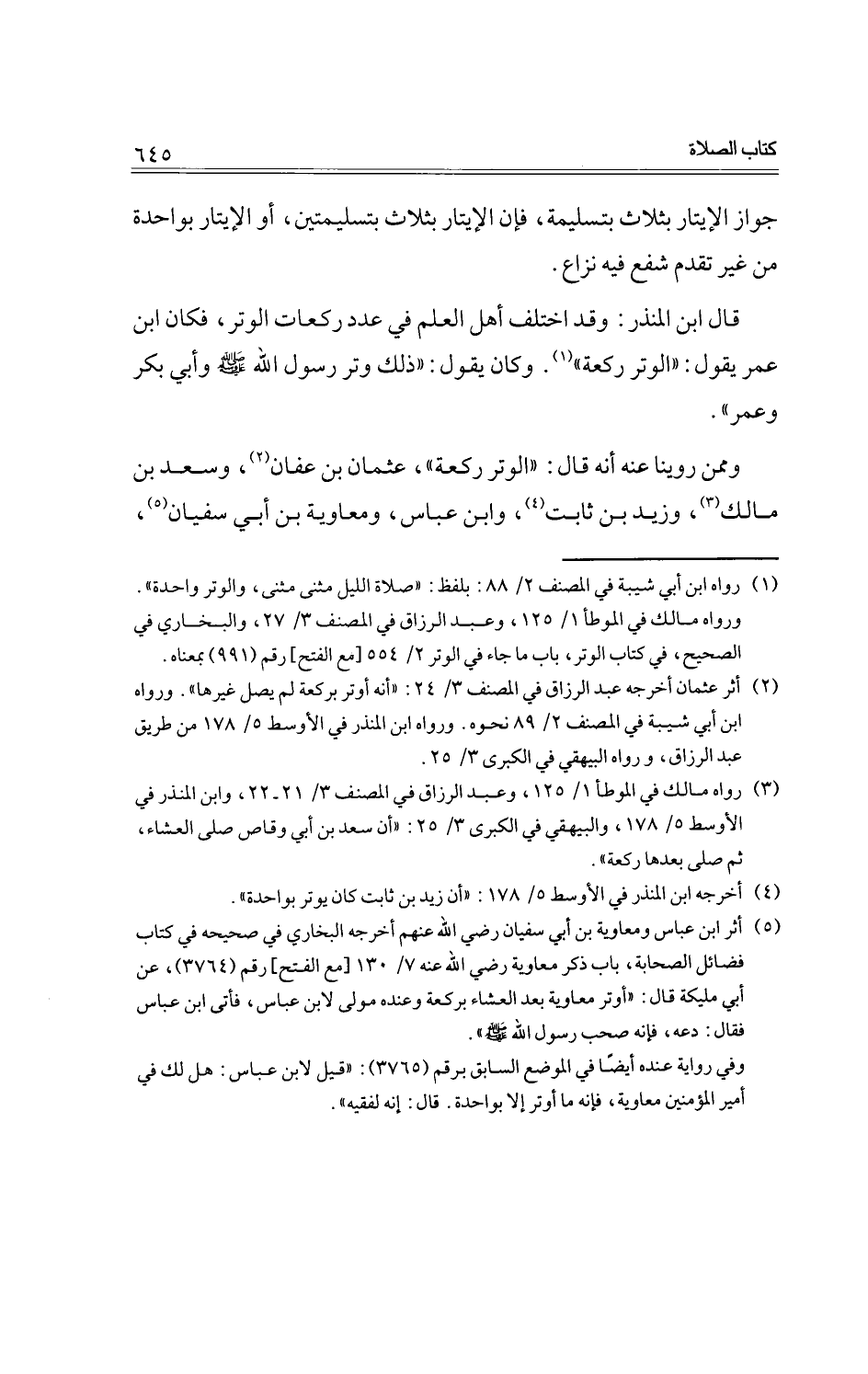 وممن روينا عنه أنه قال: ((الوتر ركعة))، عثمان بن عفان، وسعد بن مالك، وزيد بن ثابت، وابن عباس، ومعاوية بن أبي سفيان،