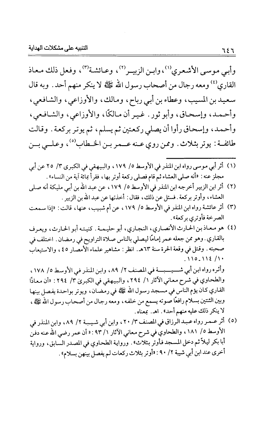 وأبي موسى الأشعري، وابن الزبير، وعائشة، وفعل ذلك معاذ القاري ومعه رجال من أصحاب رسول الله -صلى الله عليه وسلم- لا ينكر منهم أحد. وبه قال سعيد بن المسيب، وعطاء بن أبي رباح، ومالك، والأوزاعي، والشافعي، وأحمد، وإسحاق، وأبو ثور. غير أن مالكًا، والأوزاعي، والشافعي، وأحمد، وإسحاق رأوا أن يصلي ركعتين ثم يسلم، ثم يوتر بركعة. وقالت طائفة: يوتر بثلاث. وممن روي عنه عمر بن الخطاب، وعلي بن