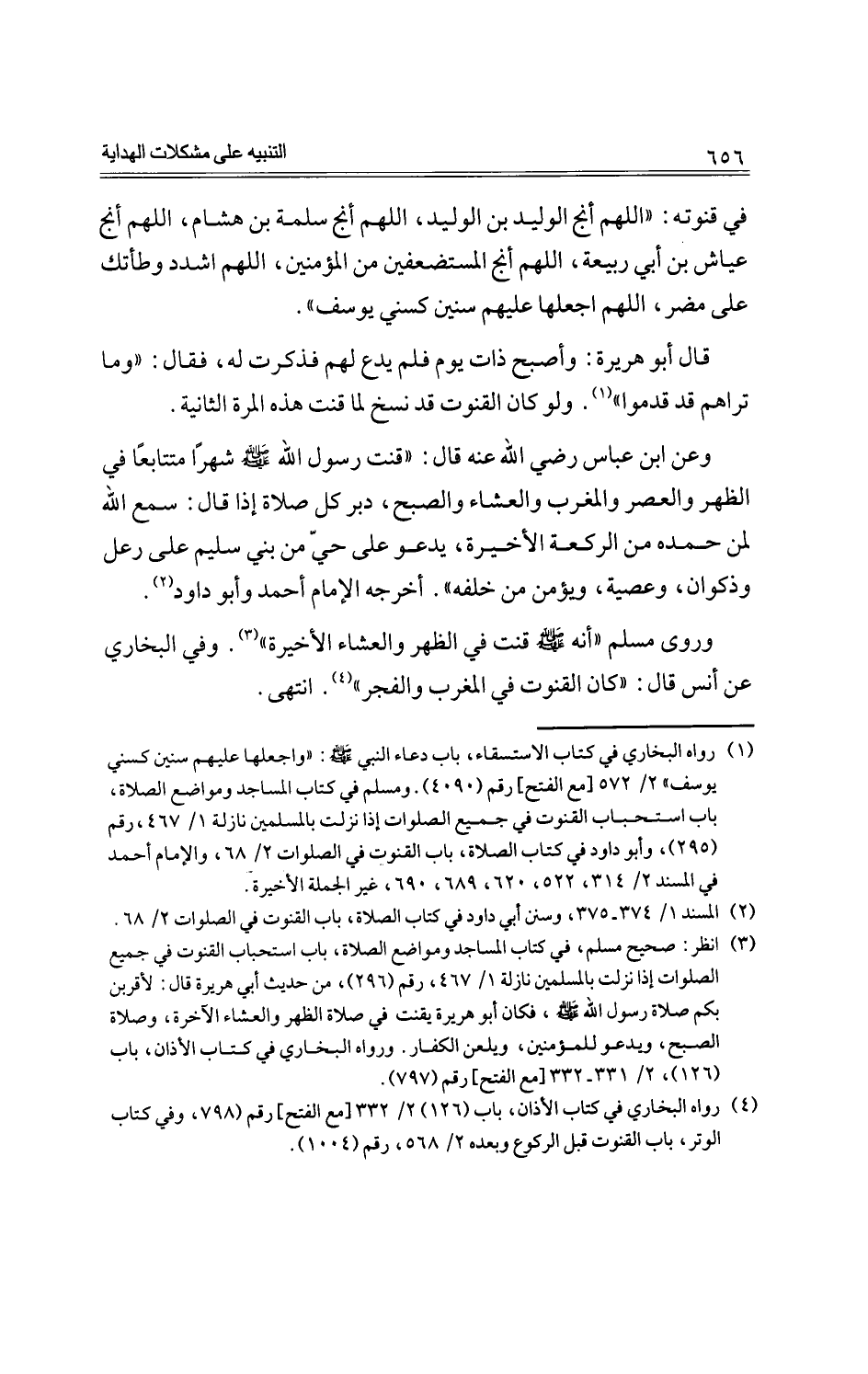وروى مسلم "أنه صلي الله عليه وسلم قنت في الظهر والعشاء الأخيرة". وفي البخاري عن أنس قال: "كان القنوت في المغرب والفجر". انتهى.