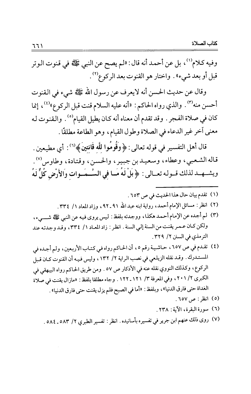 وقال عن حديث الحسن أنه لا يعرف عن رسول الله صلي الله عليه وسلم شيء في القنوت أحسن منه. والذي رواه الحاكم: "أنه عليه السلام قنت قبل الركوع"، إنما كان في صلاة الفجر. وقد تقدم أن معناه أنه كان يطيل القيام. والقنوت له معنى آخر غير الدعاء في الصلاة وطول القيام وهو الطاعة مطلقاً.
