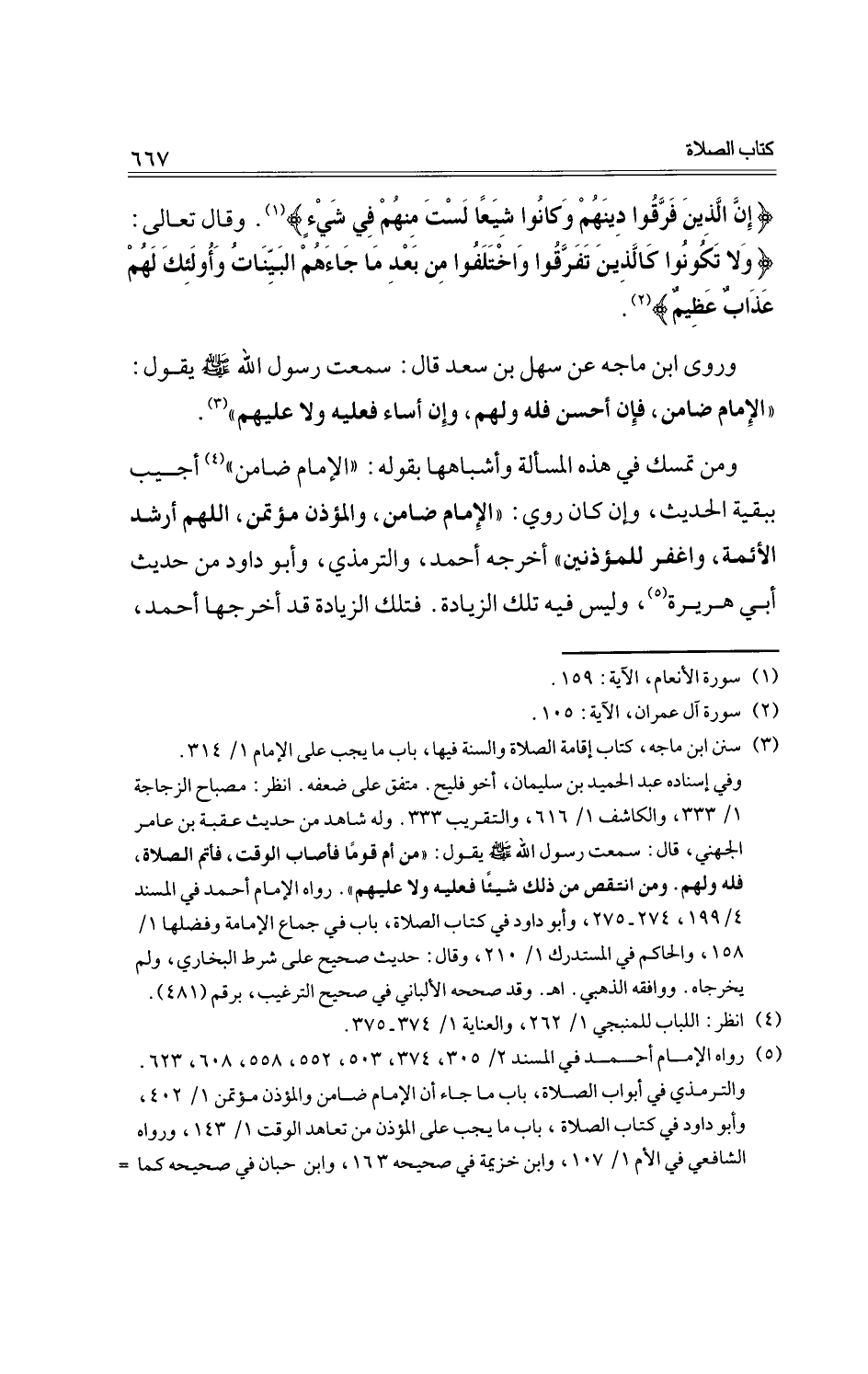 ومن تمسك في هذه المسألة وأشباهها بقوله: "الإمام ضامن" أجيب ببقية الحديث، وإن كان روي: "الإمام ضامن، والمؤذن مؤتمن، اللهم أرشد الأئمة، واغفر للمؤذنين" أخرجه أحمد، والترمذي، وأبي داود من حديث أبي هريرة، وليس فيه تلك الزيادة. فتلك الزيادة قد أخرجها أحمد،