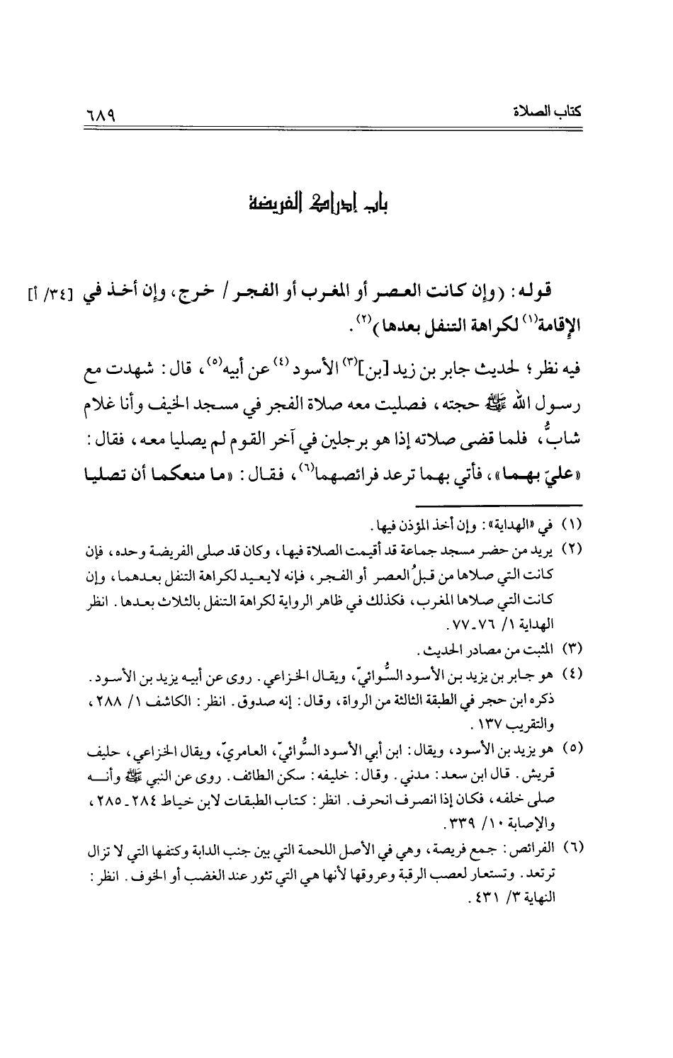 فيه نظر؛ لحديث جابر بن زيد [بن] الأسود عن أبيه، قال: شهدت مع رسول الله -صلى الله عليه وسلم- حجته، فصليت معه صلاة الفجر في مسجد الخيف وأنا غلام شاب، فلما قضى صلاته إذا هو برجلين في آخر القوم لم يصليا معه، فقال: "علي بهما"، فأتي بهما ترعد فرائصهما، فقال: "ما منعكما أن تصليا