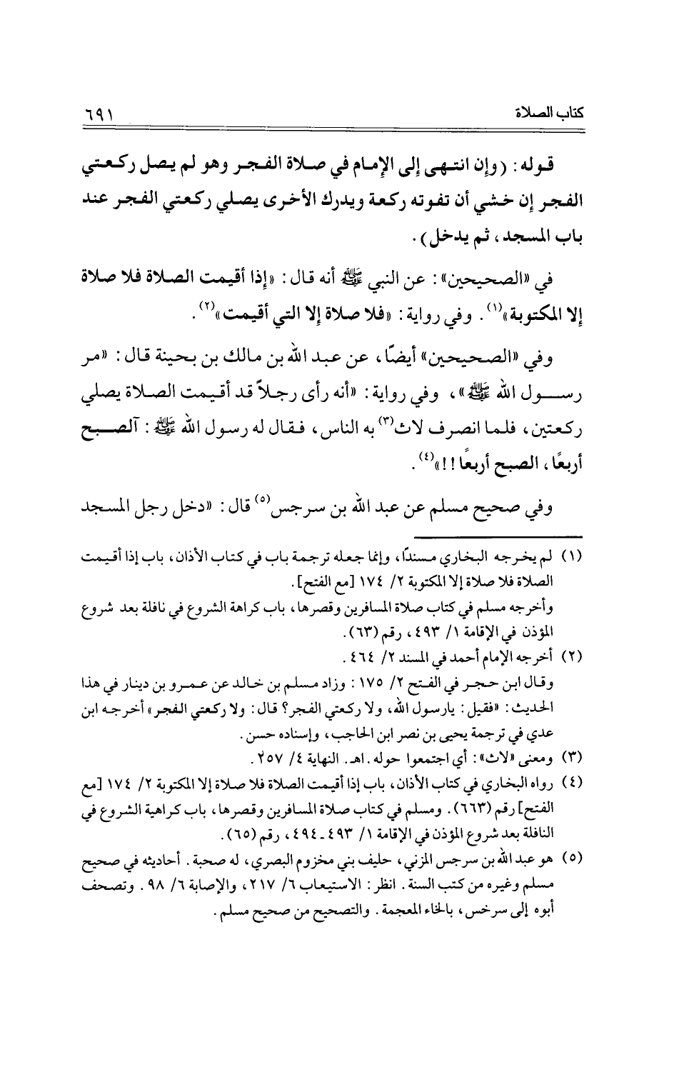 وفي "الصحيحين" أيضًا، عن عبد الله بن مالك بن بحينة قال: "مر رسول الله -صلى الله عليه وسلم-"، وفي رواية: "أنه رأى رجلًا قد أقيمت الصلاة يصلي ركعتين، فلما انصرف لاث به الناس، فقال له رسول الله -صلى الله عليه وسلم-: آلصبح أربعًا، الصبح أربعًا!! ".