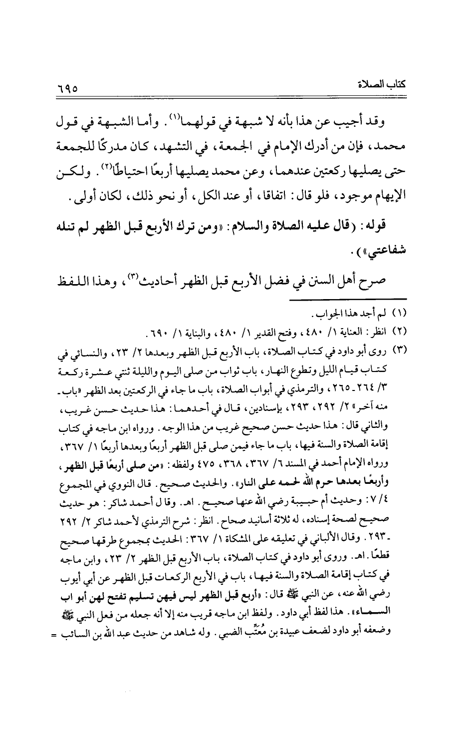 قوله: (قال عليه الصلاة والسلام: "ومن ترك الأربع قبل الظهر لم تنله شفاعتي".