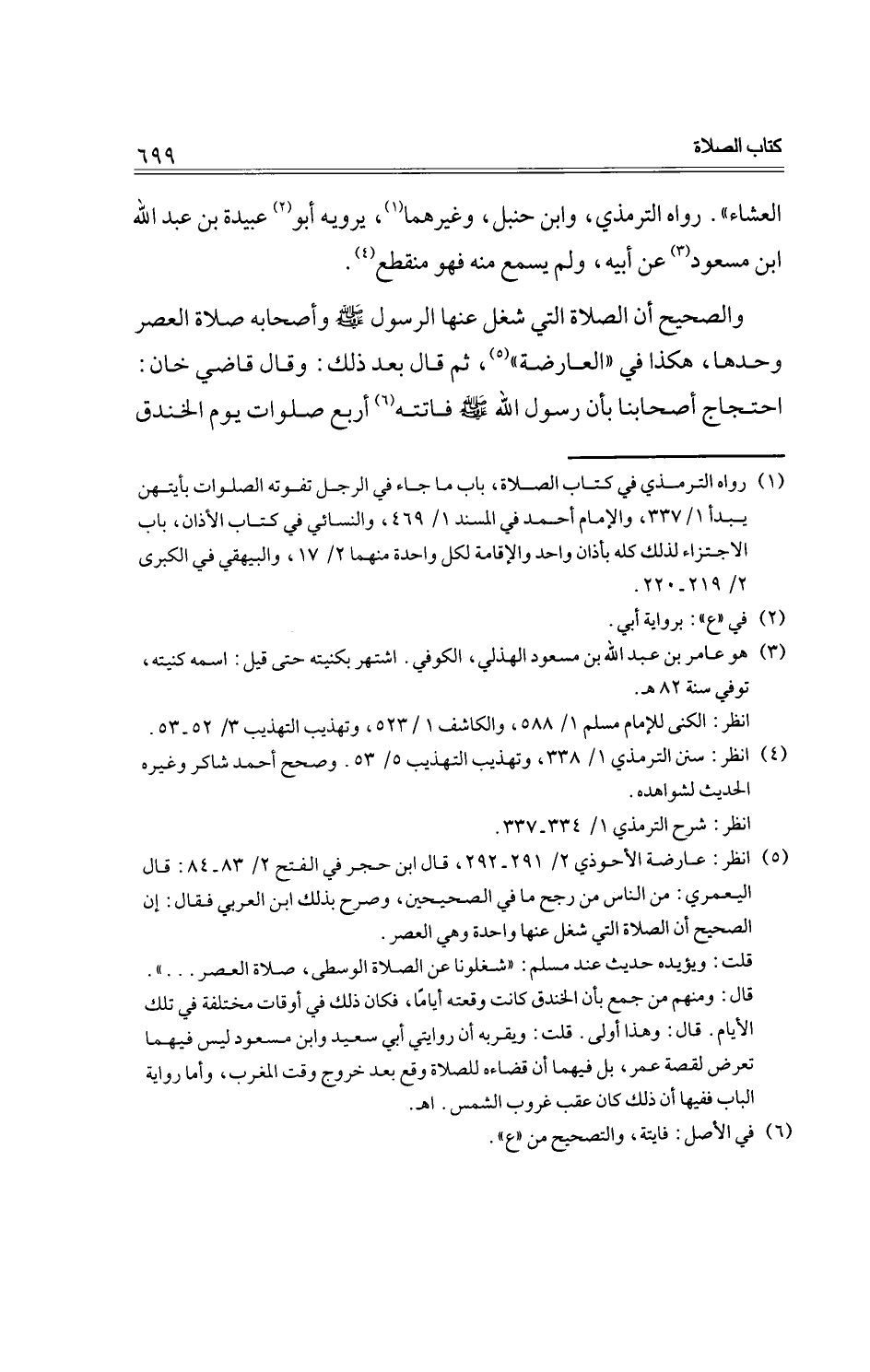 والصحيح أن الصلاة التي شغل عنها الرسول صلي الله عليه وسلم وأصحابه صلاة العصر وحدها، هكذا في "العارضة"، ثم قال بعد ذلك: وقال قاضي خان: احتجاج أصحابنا بأن رسول الله صلي الله عليه وسلم فاتته أربع صلوات يوم الخندق