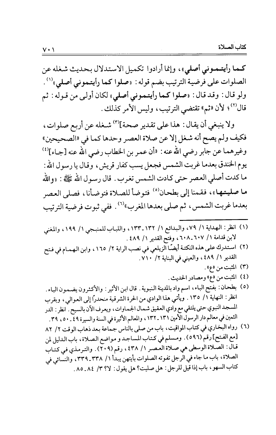 ولا ينبغي أن يقال: هذا على تقدير صحة شغله عن أربع صلوات، فكيف ولم يصح أنه شغل إلا عن صلاة العصر وحدها كما في "الصحيحين" وغيرهما عن جابر رضي الله عنه: "أن عمر بن الخطاب رضي الله عنه [جاء] يوم الخندق بعدما غربت الشمس فجعل يسب كفار قريش، وقال يا رسول الله: ما كدت أصلي العصر حتى كادت الشمس تغرب. قال رسول الله صلي الله عليه وسلم: "والله ما صليتها"، فقمنا إلى بطحان فتوضأ للصلاة فتوضأنا، فصلى العصر بعدما غربت الشمس، ثم صلى بعدها المغرب". ففي ثبوت فرضية الترتيب