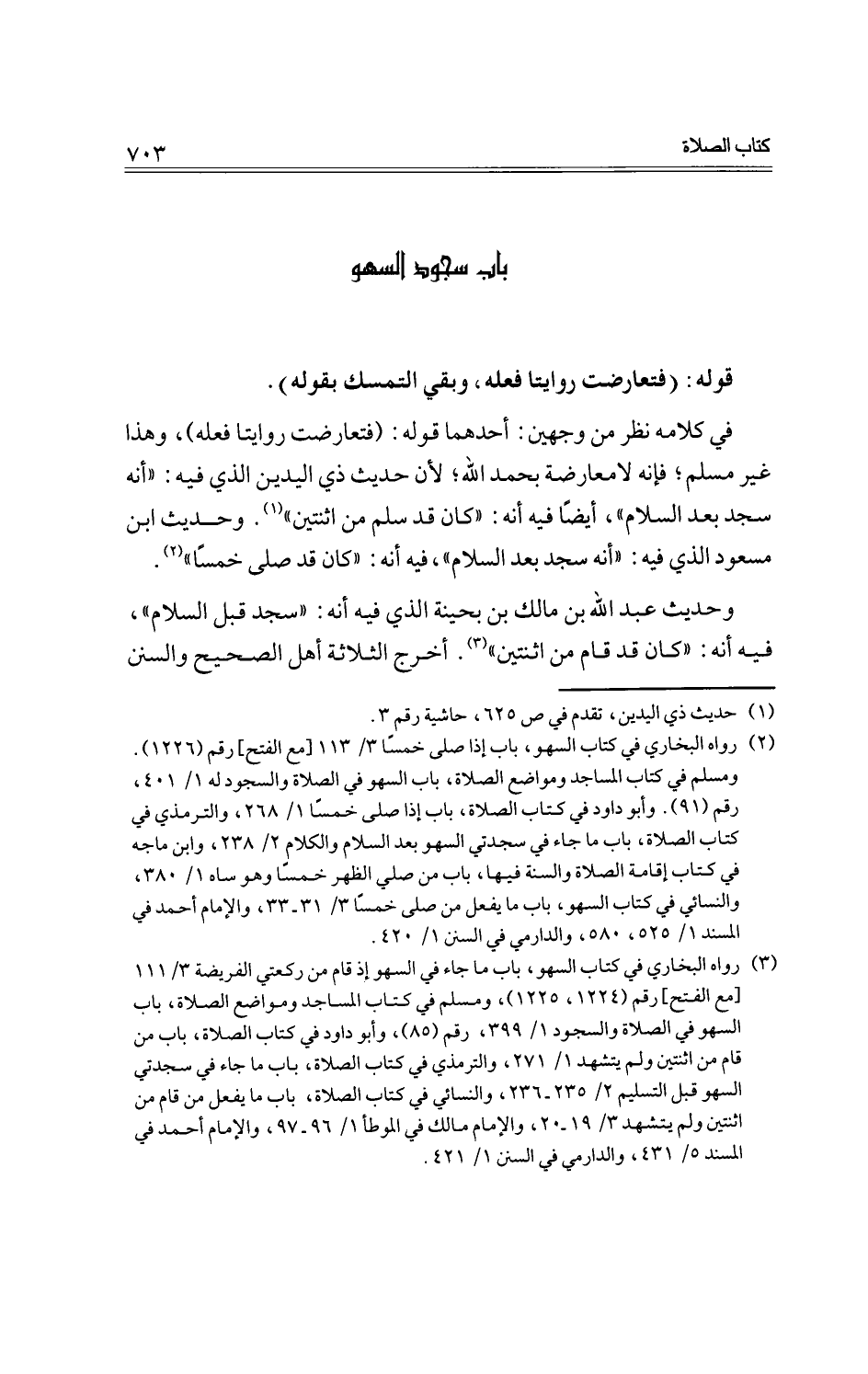 في كلامه نظر من وجهين: أحدهما قوله: (فتعارضت روايتا فعلة)، وهذا غير مسلم؛ فإنه لا معارضة بحمد الله، لأن حديث ذي اليدين الذي فيه: "أنه سجد بعد السلام"، أيضاً فيه أنه: "كان قد سلم من اثنتين". وحديث ابن مسعود الذي فيه: "أنه سجد بعد السلام"،فيه أنه: "كان قد صلى خمساً".
