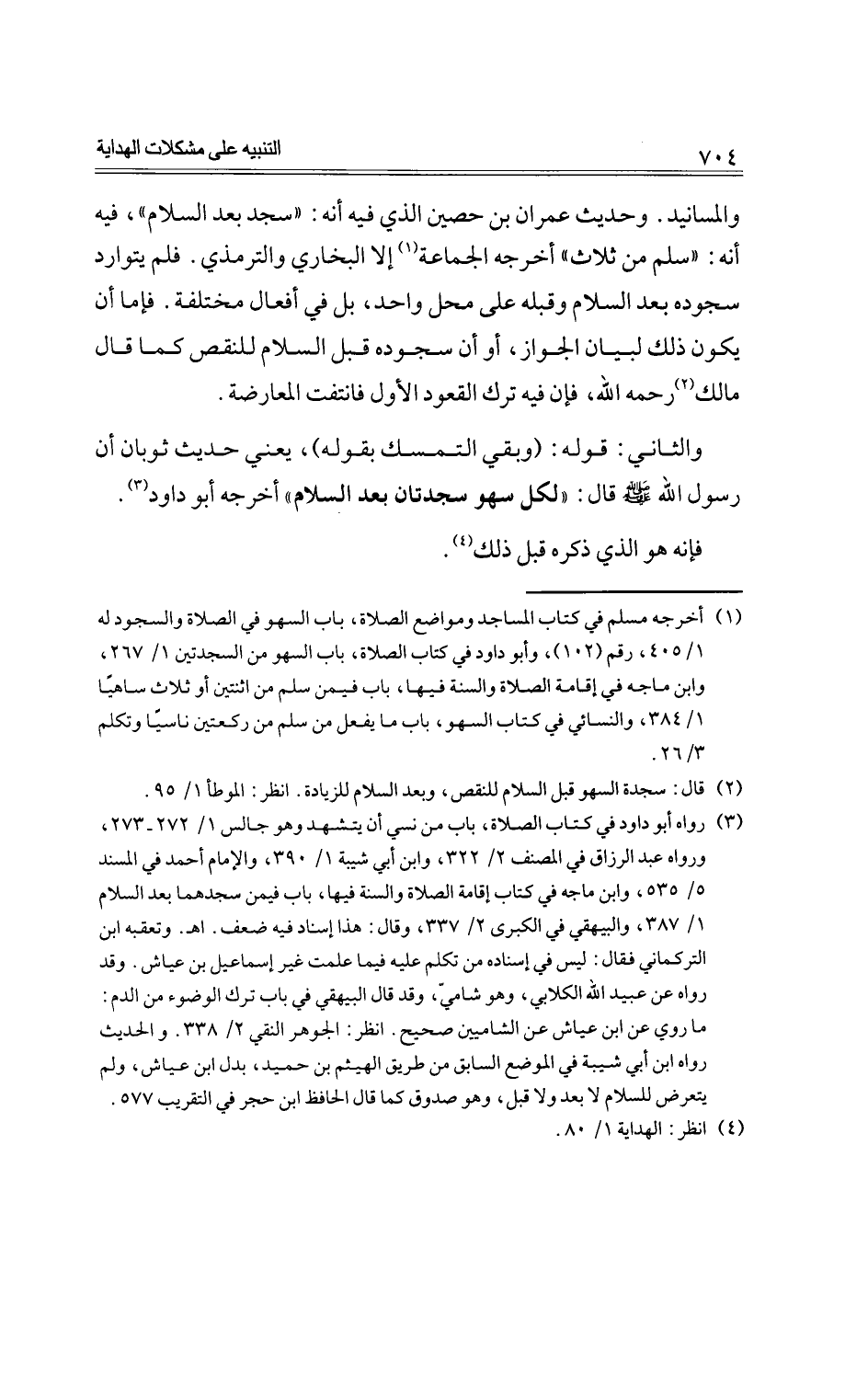 والمسانيد. وحديث عمران بن حصين الذي في أنه: "سجد بعد السلام"، فيه أنه: "سلم من ثلاث" أخرجه الجماعة إلا البخاري والترمذي. فلم يتوارد سجوده بعد السلام وقبله على محل واحد، بل في أفعال مختلفة. فإما أن يكون ذلك لبيان الجواز، أو أن سجوده قبل السلام للنقص كما قال مالك رحمه الله، فإن فيه ترك القعود الأول فانتفت المعارضة.