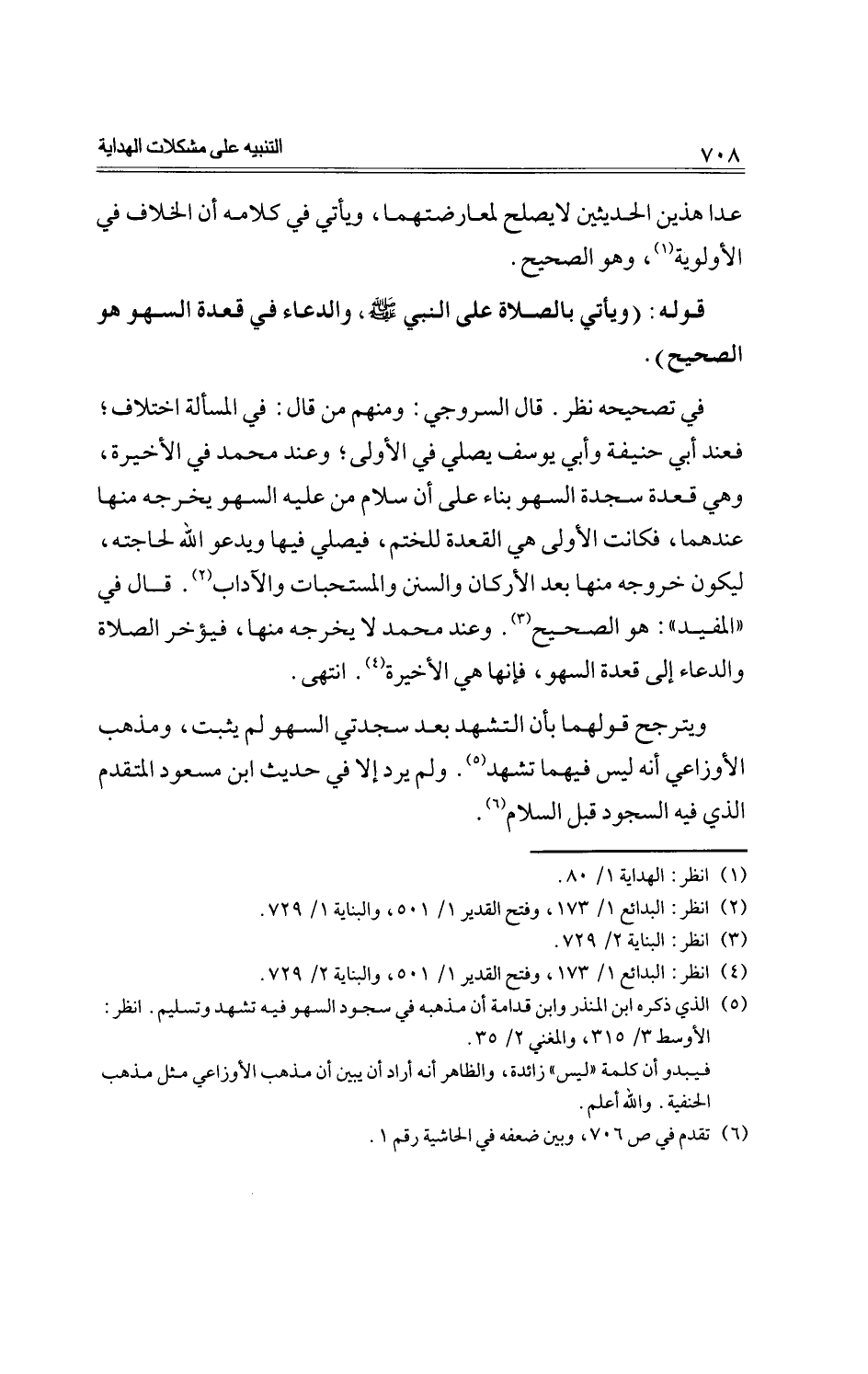 في تصحيحه نظر. قال السروجي: ومنهم من قال: في المسألة اختلاف؛ فعند أبي حنيفة وأبي يوسف يصلي في الأولى؛ وعند محمد في الأخيرة، وهي قعدة سجدة السهو بناء على أن سلام من عليه السهو يخرجه منها عندهما، فكانت الأولى هي القعدة للختم، فيصلي فيها ويدعو الله لحاجته، ليكون خروجه منها بعد الأركان والسنن والمستحبات والآداب. قال في "المفيد": هو الصحيح. وعند محمد لا يخرجه منها، فيؤخر الصلاة والدعاء إلى قعدة السهو، فإنها هي الأخيرة. انتهى.