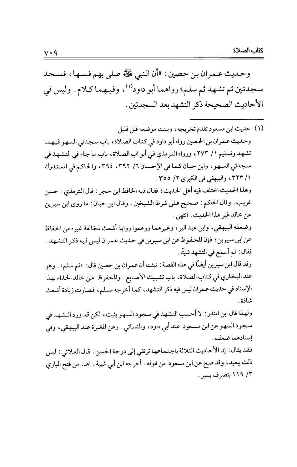 وحديث عمران بن حصين: "أن النبي صلي الله عليه وسلم صلي بهم فسها، فسجد سجدتين ثم تشهد ثم سلم" رواهما أبو داود، وفيهما كلام. وليس في الأحاديث الصحيحة ذكر التشهد بعد السجدتين.