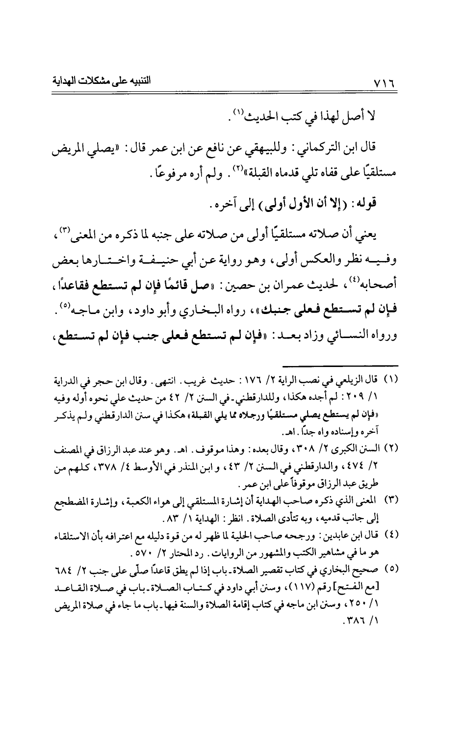 يعني أن صلاته مستلقياً أولى من صلاته على جنبة لما ذكره من المعنى وفية نظر والعكس أولى، وهو رواية عن أبي حنيفة واختارها بعض أصحابه، لحديث عمران بن حصين: "صل قائماً فإن لم تستطع فقاعداً، فإن لم تستطع فعلى جنبك"، رواه البخاري وأبو داود، وابن ماجه. ورواه النسائي وزاد بعد: "فإن لم تستطع فعلى جنب فإن لم تستطع،