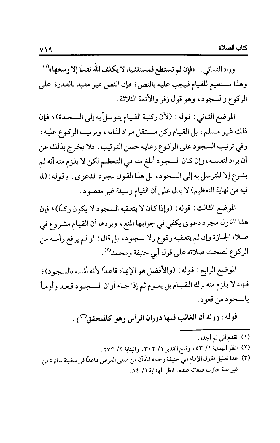 وزاد النسائي: "فإن لم تستطع فمستلقياً، لا يكلف الله نفساً إلا وسعها". وهذا مستطيع للقيام فيجب عليه بالنص؛ فإن النص غير مقيد بالقدرة علي الركوع والسجود، وهو قول زفر والأئمة الثلاثة.