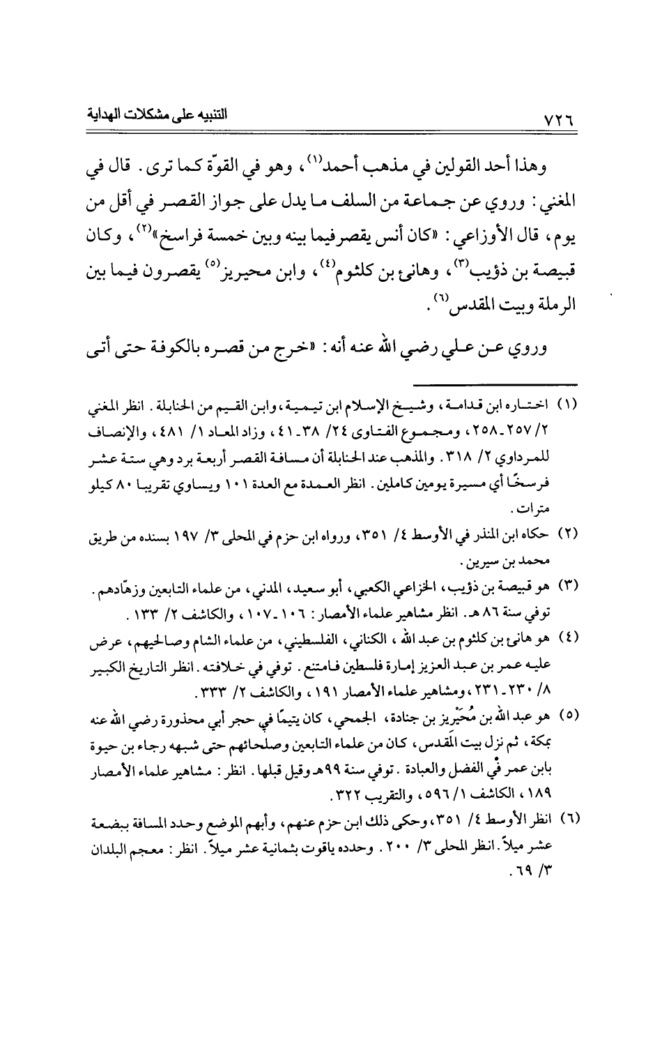 وهذا أحد القولين في مذهب أحمد، وهو في القوة كما ترى. قال في المغني: وروي عن جماعة من السلف ما يدل على جواز القصر في أقل من يوم، قال الأوزاعي: "كان أنس يقصر فيما بينة وبين خمسة فراسخ" وكان قبيصة بن ذؤيب، وهانئ بن كلثوم، وابن محيريز يقصرون فيما بين الرملة وبيت المقدس.