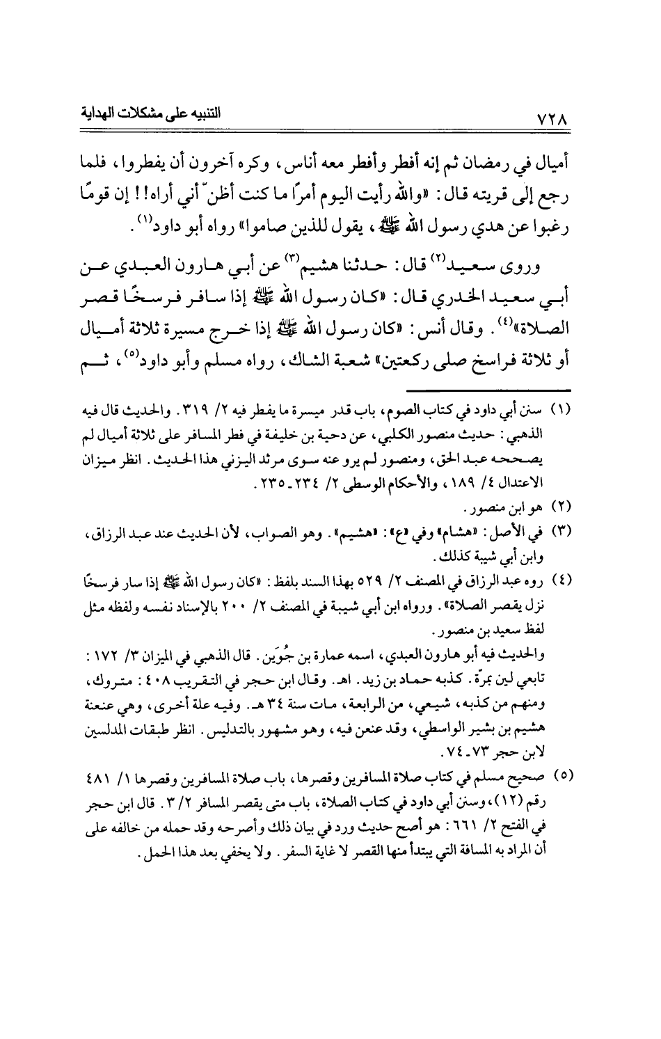 وروى سعيد قال: حدثنا هشيم عن أبي هارون العبدي عن أبي سعيد الخدري قال: كان رسول الله -صلى الله عليه وسلم- إذا سافر فرسخًا قصر الصلاة. وقال أنس: "كان رسول -صلى الله عليه وسلم- إذا خرج مسيرة ثلاثة أميال أو ثلاثة فراسخ صلى ركعتين" شعبة الشاك، رواه مسلم وأبو داود، ثم