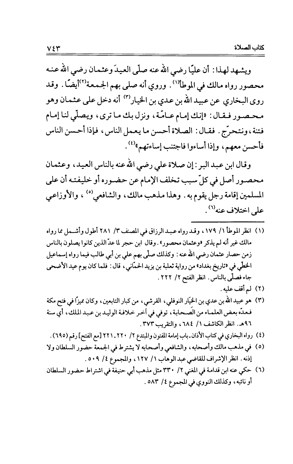 وقال ابن عبد البر: إن صلاة على-رضي الله عنه -بالناس العيد، وعثمان محصور أصل في كل سبب تخلف الإمام عن حضوره أو خليفته أن على المسلمين إقامة رجل يقوم به. وهذا مذهب مالك، والشافعي، والأوزعي على اختلاف عنه.