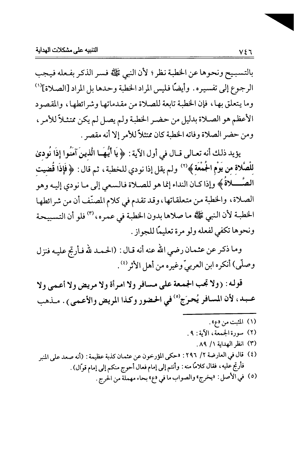 بالتسبيح ونحوها عن الخطبة نظر، لأن النبي-صلي الله عليه وسلم-فسر الذكر بفعله فيجب الرجوع إلى تفسيره. وأيضًا فليس المراد الخطبة وحدها بل المراد [الصلاة] وما يتعلق بها، فإن الخطبة تابعة للصلاة من مقدمتها وشرائطها، والمقصود الأعظم هو الصلاة بدليل من حضر الخطبة ولم يصل لم يكن متمثلا للأمر، ومن حضر الصلاة وفاته الخطبة كان ممتثلا للأمر إلا أنه مقصر.