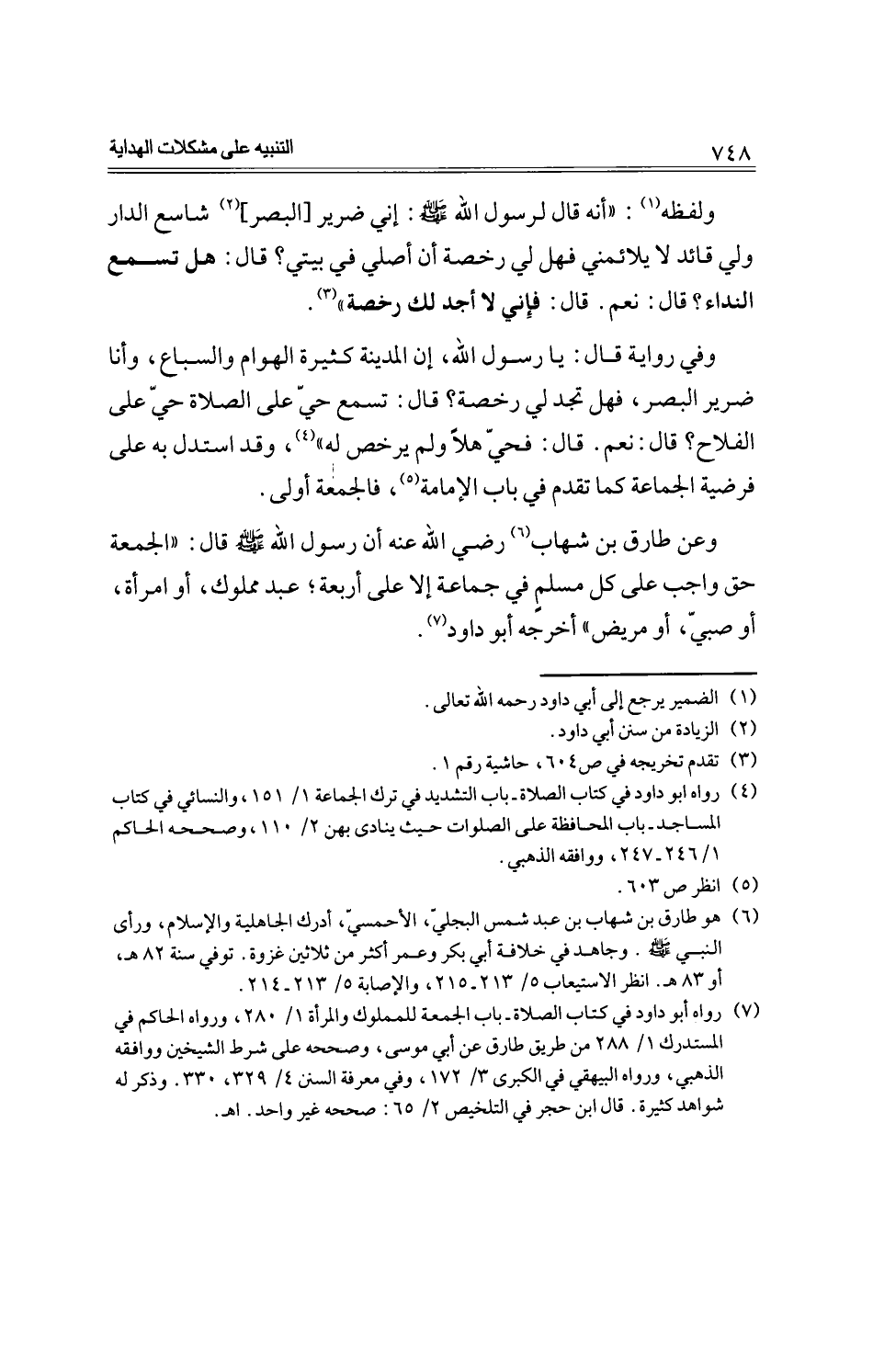 وعن طارق بن شهاب -رضي الله عنه- أن رسول الله صلى الله عليه وسلم- قال: ((الجمعة حق واجب على كل مسلم في جماعة إلا على أربعة؛ عبد مملوك، أو امرأة، أو صبي، أو مريض)) أخرجه أبو داود.