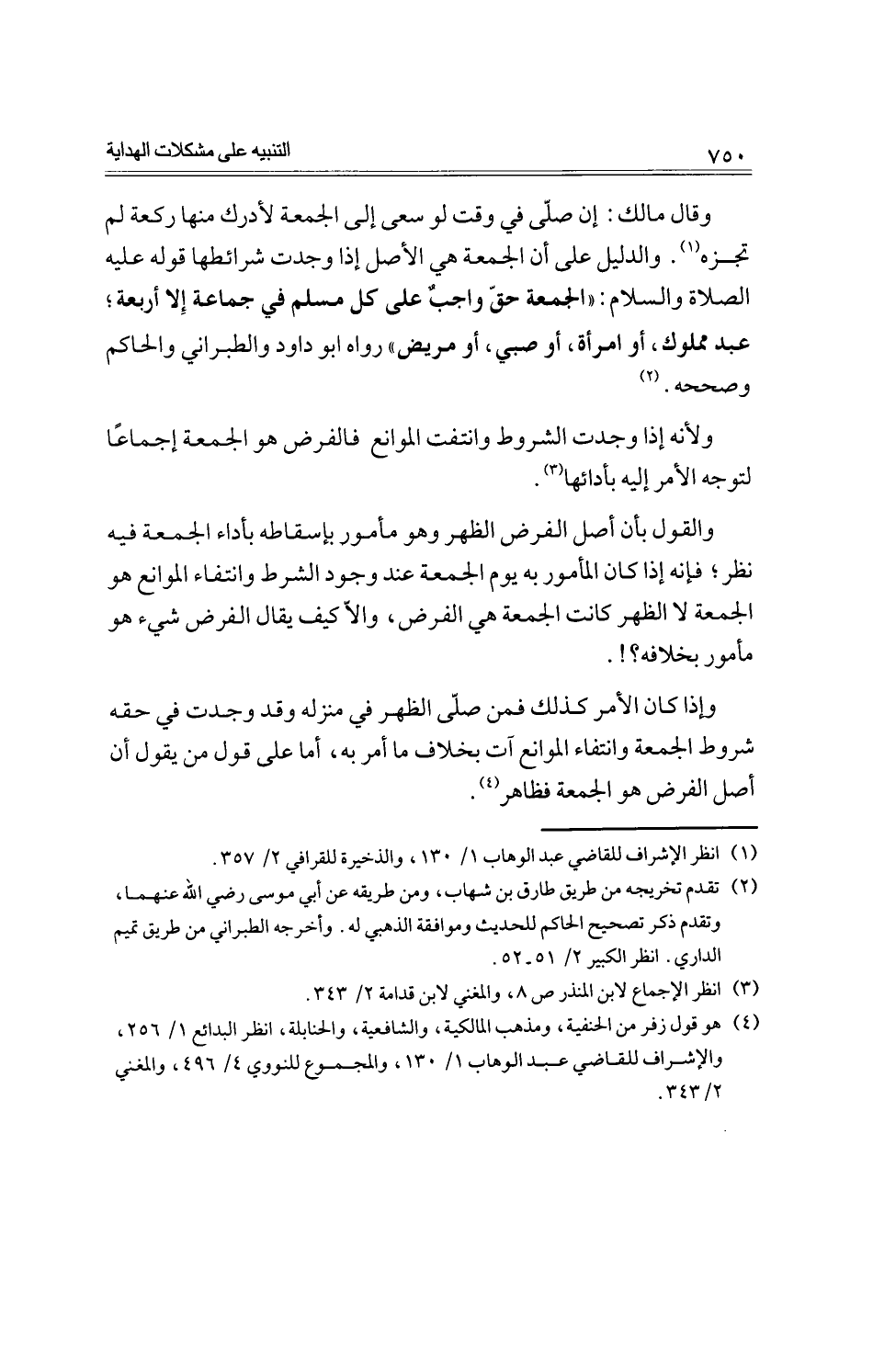 وقال مالك: إن صلى في وقت لو سعى إلى الجمعة لأدرك منها ركعة لم تجزه. والدليل على أن الجمعة هي الأصل إذا وجدت شرائطها قوله عليه -الصلاة والسلام-: ((الجمعة حق واجب على كل مسلم في جماعة إلا أربعة؛ عبد مملوك، أو امرأة، أو صبي، أو مريض)) رواه أبو داود والطبراني والحاكم وصححه.