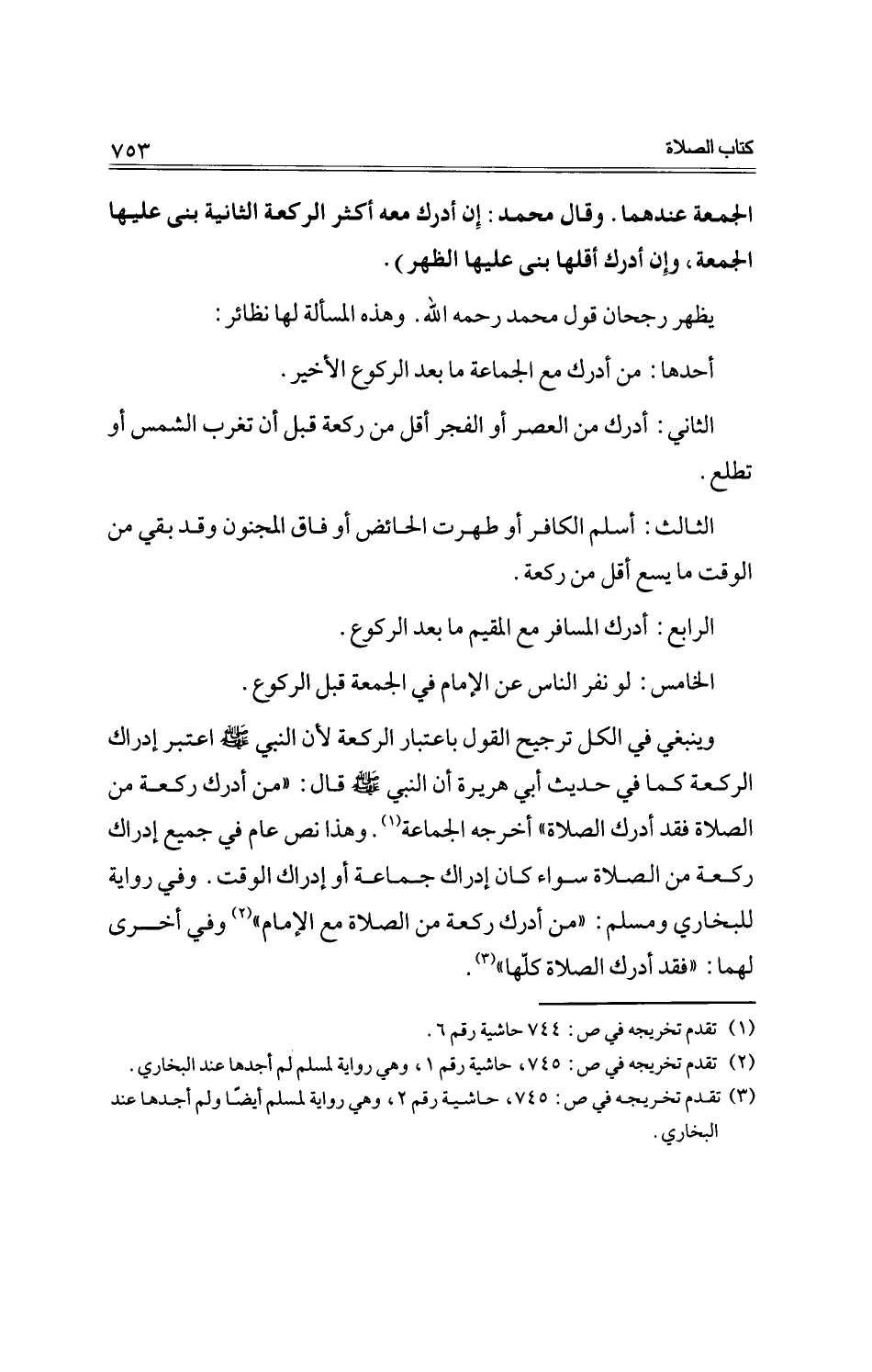 وينبغي في الكل ترجيح القول باعتبار الركعة لأن النبي -صلى الله عليه وسلم- اعتبر إدراك الركعة كما في حديث أبي هريرة أن النبي -صلى الله عليه وسلم- قال: ((من أدرك ركعة من الصلاة فقد أدرك الصلاة)) أخرجه الجماعة. وهذا نص عام في جميع إدراك ركعة من الصلاة سواء كان إدراك جماعة أو إدراك وقت. وفي رواية للبخاري ومسلم: ((من أدرك ركعة من الصلاة مع الإمام)) وفي أخرى لهما: ((فقد أدرك الصلاة كلها)).