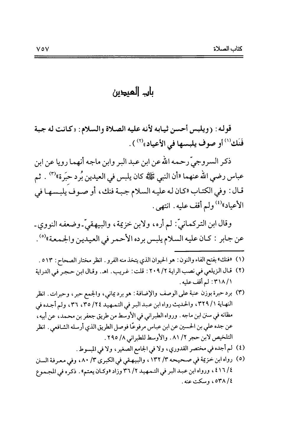 ذكر السروجي -رحمه الله- عن ابن عبد البر وابن ماجه أنهما رويا عن ابن عباس -رضي الله عنهما- ((أن النبي -صلى الله عليه وسلم- كان يلبس في العيدين برد حبرة)). ثم قال: وفي الكتاب ((كان له -عليه السلام- جبة فنك، أو صوف يلبسها في الأعياد)) ولم أقف عليه. انتهى.