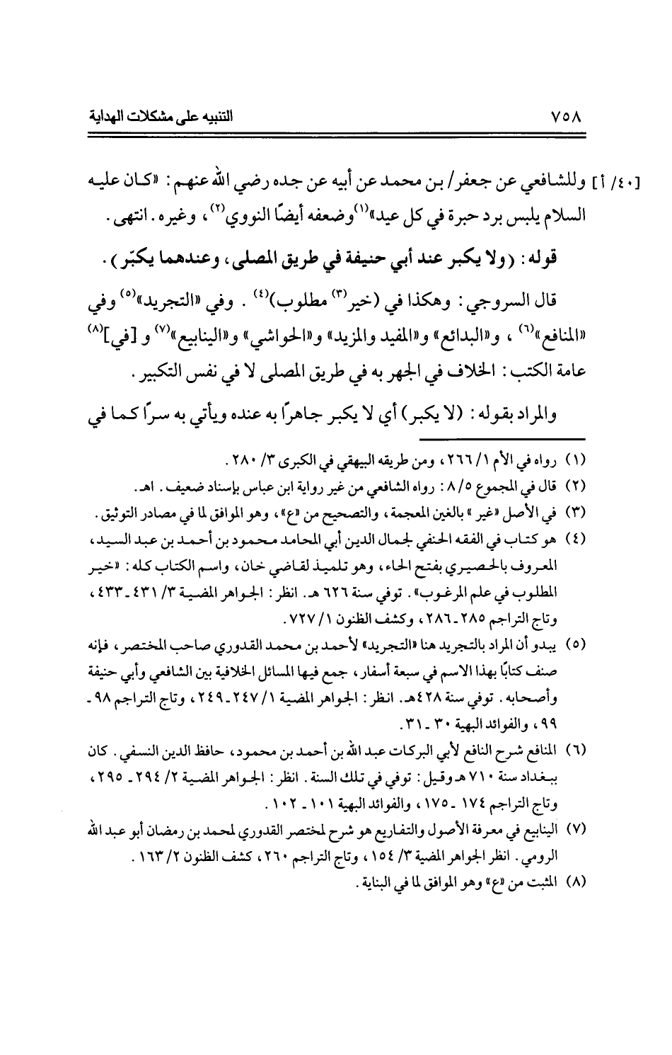 قال السروجي: وهكذا في (خير مطلوب). وفي (التجريد)) وفي ((المنافع))، و ((البدائع)) و ((المفيد والمزيد)) و ((الحواشي)) و ((الينابيع)) و [في] عامة الكتب: الخلاف في الجهر به في طريق المصلى لا في نفس التكبير.