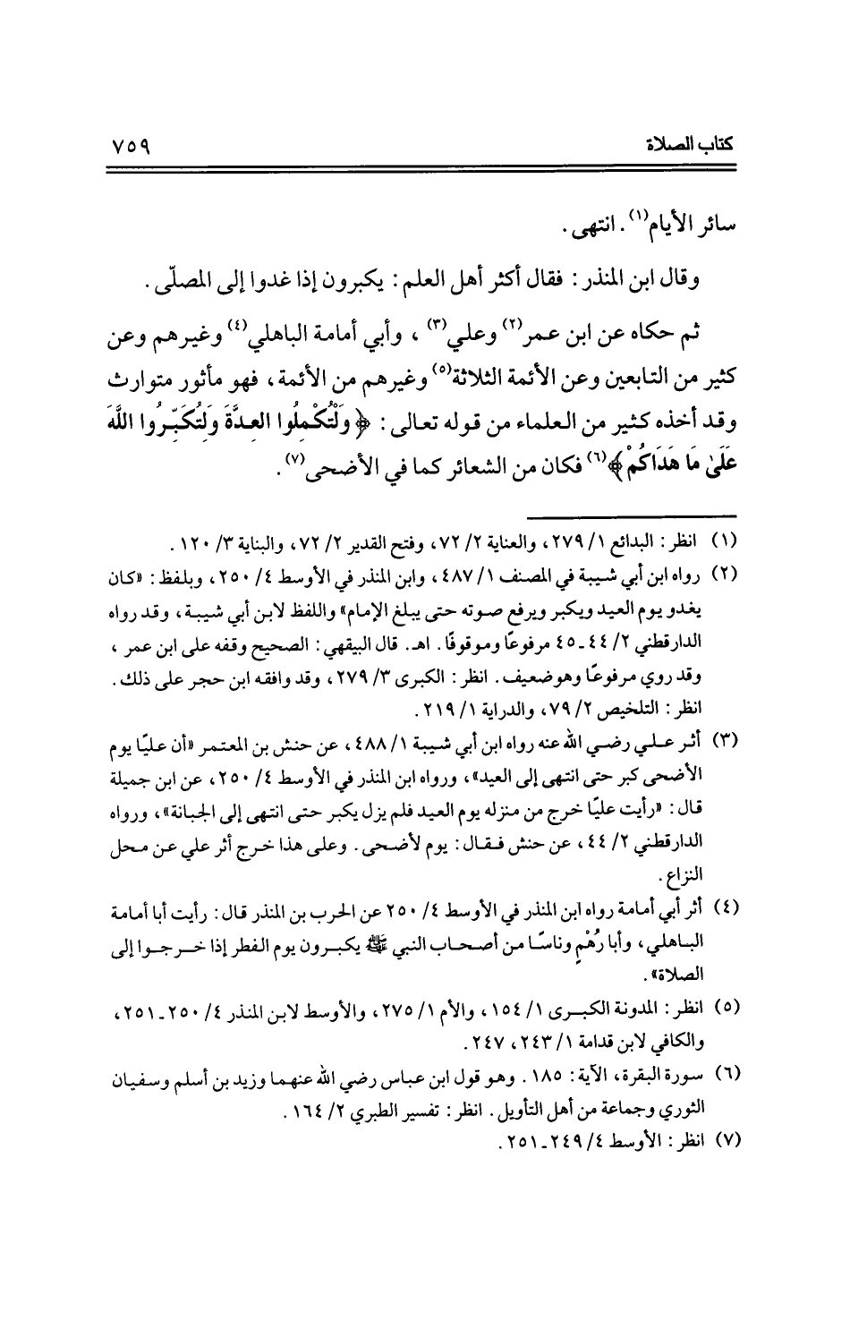 ثم حكاه عن ابن عمر وعلي، وأبي أمامة الباهلي وغيرهم وعن كثير من التابعين وعن الأئمة الثلاثة وغيرهم من الأئمة، فهو مأثور متوارث وقد أخذه كثير من العلماء من قوله تعالى: {ولتكملوا العدة ولتكبروا والله على ما هداكم} فكان من الشعائر كما في الأضحى.