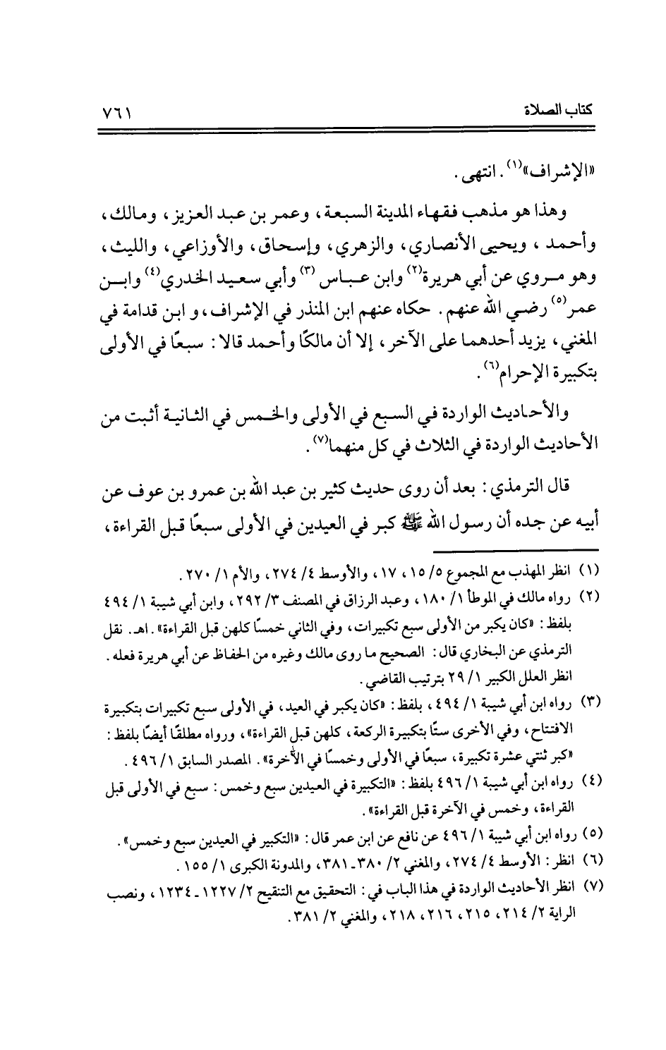 وهذا هو مذهب فقهاء المدينة السبعة، وعمر بن عبد العزيز، ومالك، وأحمد، ويحيى الأنصاري، والزهري، وإسحاق، والأوزاعي، والليث، وهو مروي عن أبي هريرة وابن عباس وأبي سعيد الخدري وابن عمر -رضي الله عنهم-. حكاه عنهم ابن المنذر في الإشراف، وابن قدامة في المغني، يزيد أحدهما على الآخر، إلا أن مالكًا وأحمد قالا: سبعًا في الأولى بتكبرة الإحرام.
