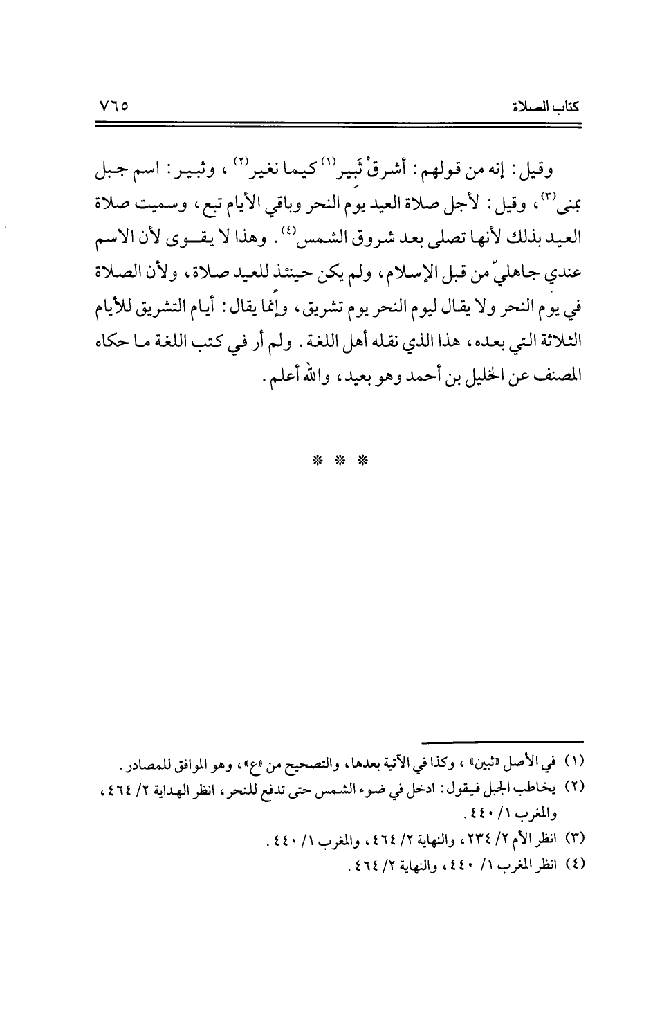 وقيل: إنه من قولهم: أشرق ثبير كيما نغير، وثبير: اسم جبل بمنى، وقيل: لأجل صلاة العيد يوم النحر وباقي الأيام تبع، وسميت صلاة العيد بذلك لأنها تصلى بعد شروق الشمس. وهذا لا يقوى لأن الاسم عندي جاهلي من قبل الإسلام، ولم يكن حينئذ للعيد صلاة، ولأن الصلاة في يوم النحر ولا يقال ليوم النحر يوم تشريق، وإنما يقال: أيام التشريق للأيام الثلاثة التي بعده، هذا الذي نقله أهل اللغة. ولم أر في كتب اللغة ما حكاه المصنف عن الخليل بن أحمد وهو بعيد، والله أعلم.