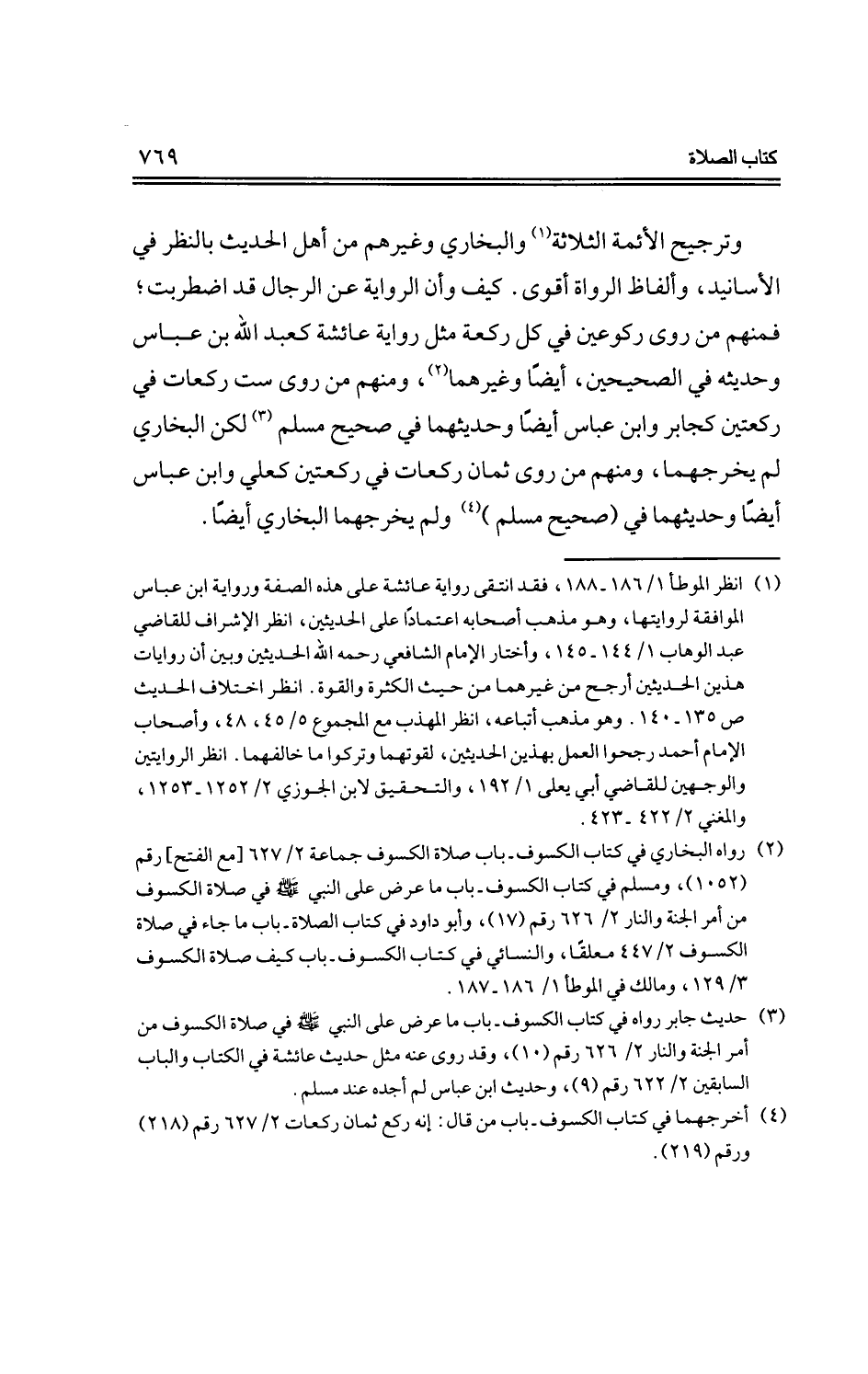 وترجيح الأئمة الثلاثة والبخاري وغيرهم من أهل الحديث بالنظر في الأسانيد، وألفاظ الرواة أقوى. فكيف وأن الرواية عن الرجال قد اضطربت؛ فمنهم من روى ركوعين في كل ركعة مثل رواية عائشة كعبد الله بن عباس وحديثه في الصحيحين، أيضاً وغيرهما، ومنهم من روى ست ركعات في ركعتين كجابر وابن عباس أيضًا وحديثهما في صحيح مسلم لكن البخاري لم يخرجهما، ومنهم من روى ثمان ركعات في ركعتين كعلي وابن عباس أيضًا وحديثهما في (صحيح مسلم) ولم يخرجهما البخاري أيضًا.