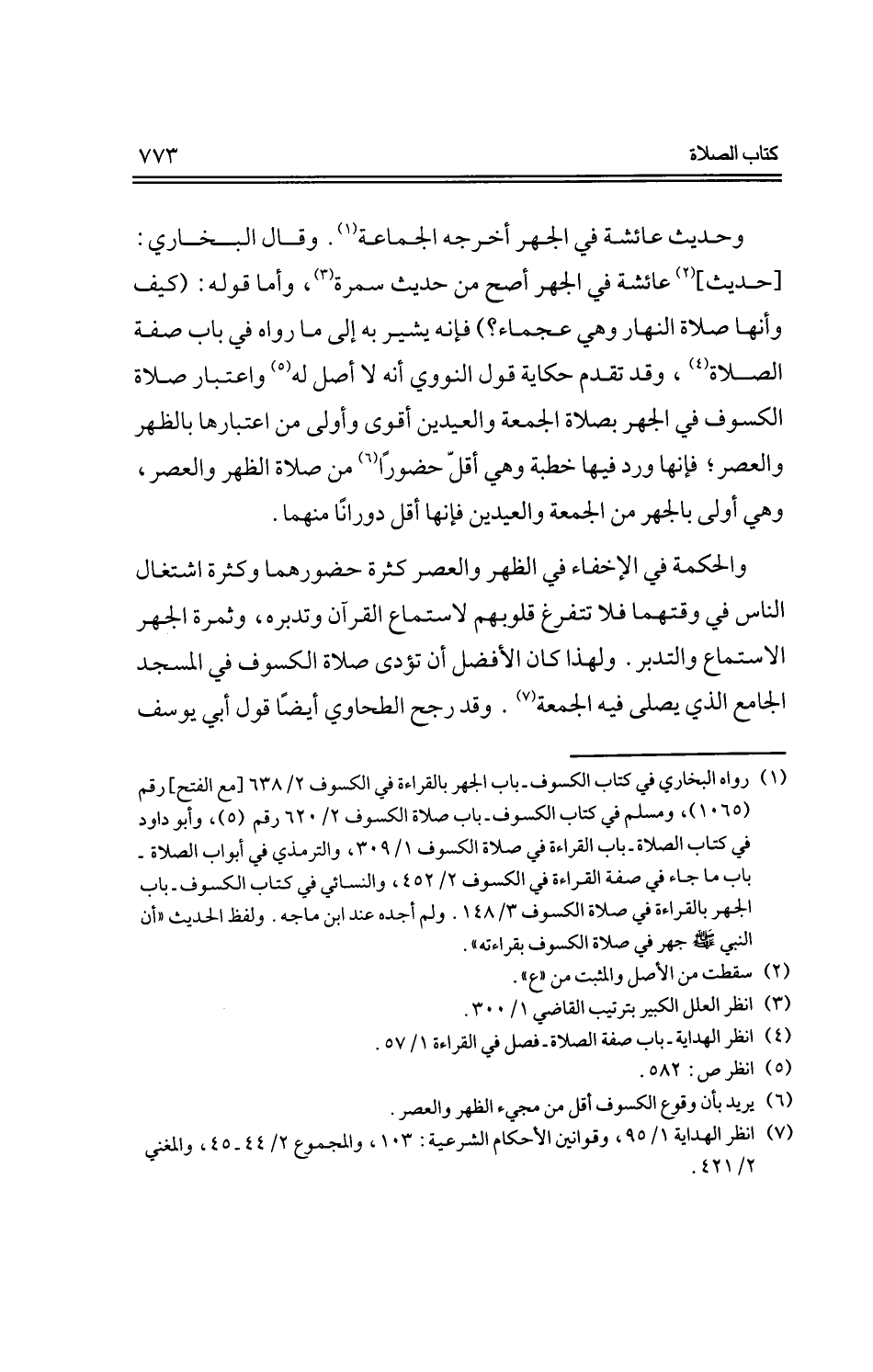 والحكمة في الإخفاء في الظهر والعصر كثرة حضورهما وكثرة اشتغال الناس في وقتهما فلا تتفرغ قلوبهم لاستماع القرآن وتدبره، وثمرة الجهر الاستماع والتدبر. ولهذا كان الأفضل أن تؤدى صلاة الكسوف في المسجد الجامع الذي يصلى فيه الجمعة. وقد رجح الطحاوي أيضًا قول أبي يوسف