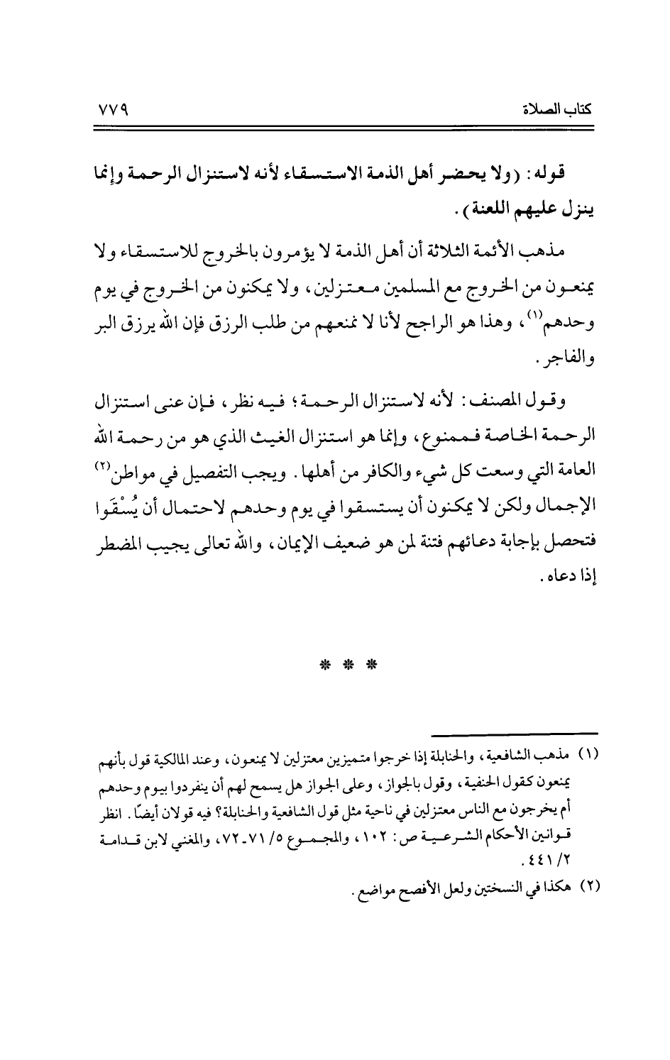 وقول المصنف: لأنه لاستنزال الرحمة؛ فيه نظر، فإن عنى استنزال الرحمة الخاصة فممنوع، وإنما هو استنزال الغيث الذي هو من رحمة الله العامة التي وسعت كل شيء والكافر من أهلها. ويجب التفصيل في مواطن الإجمال ولكن لا يمكنون أن يستسقوا في يوم وحدهم لاحتمال أن يسقوا فتحصل بإجابة دعائهم فتنة لمن هو ضعيف الإيمان، والله تعالى يجيب المضطر إذا دعاه.