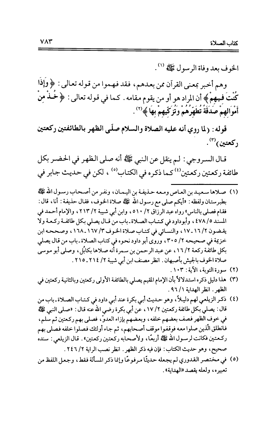 قال السروجي: لم ينقل عن النبي -صلى الله عليه وسلم- أنه صلى الظهر في الحضر بكل طائفة ركعتين ركعتين كما ذكره في الكتاب لكن في حديث جابر في