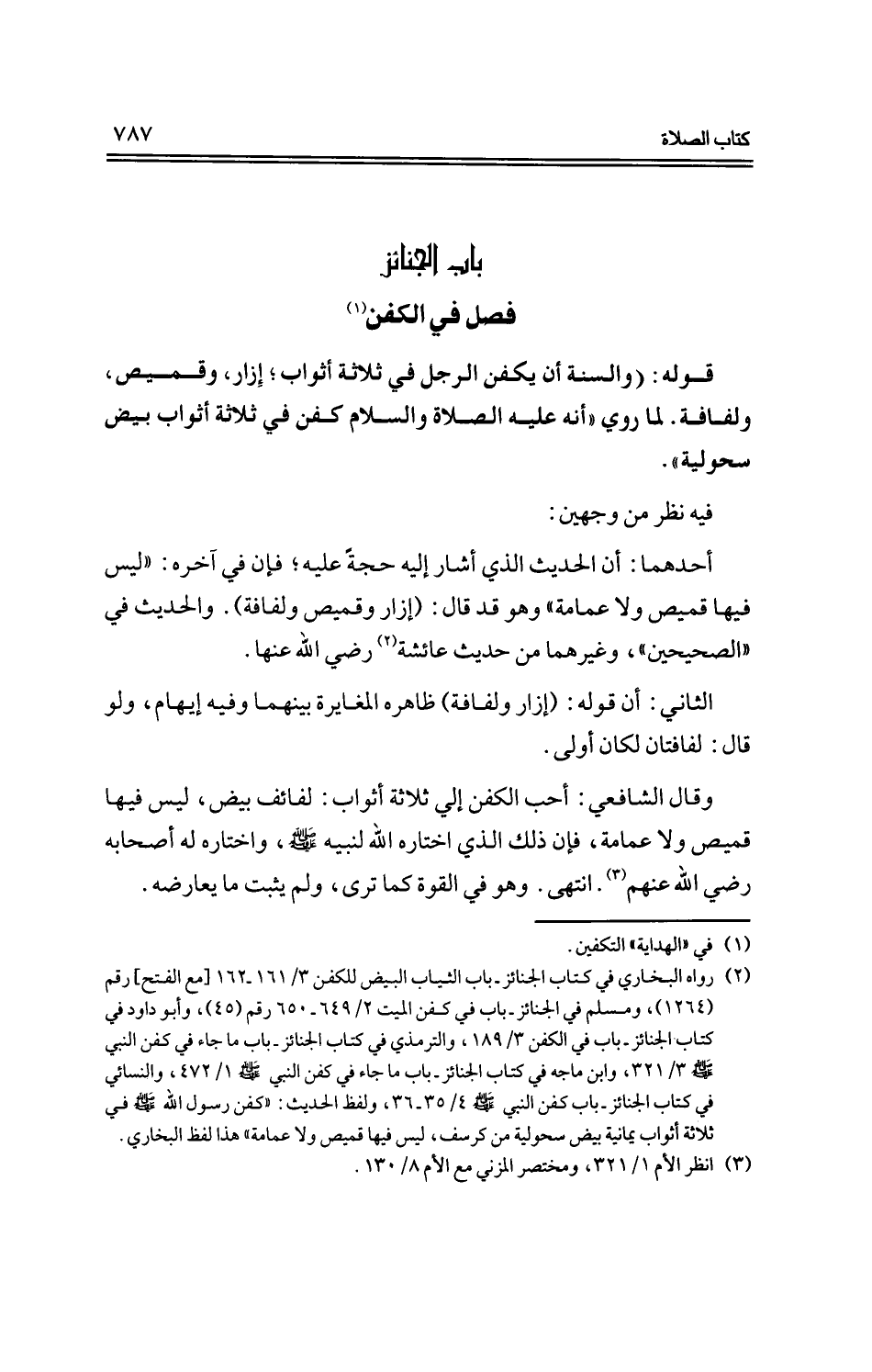 أحدهما: أن الحديث الذي أشار إليه حجة عليه؛ فإن في آخره: "ليس فيها قميص ولا عمامة" وهو قد قال: (إزار وقميص ولفافة). والحديث في "الصحيحين"، وغيرهما من حديث عائشة رضى الله عنها.