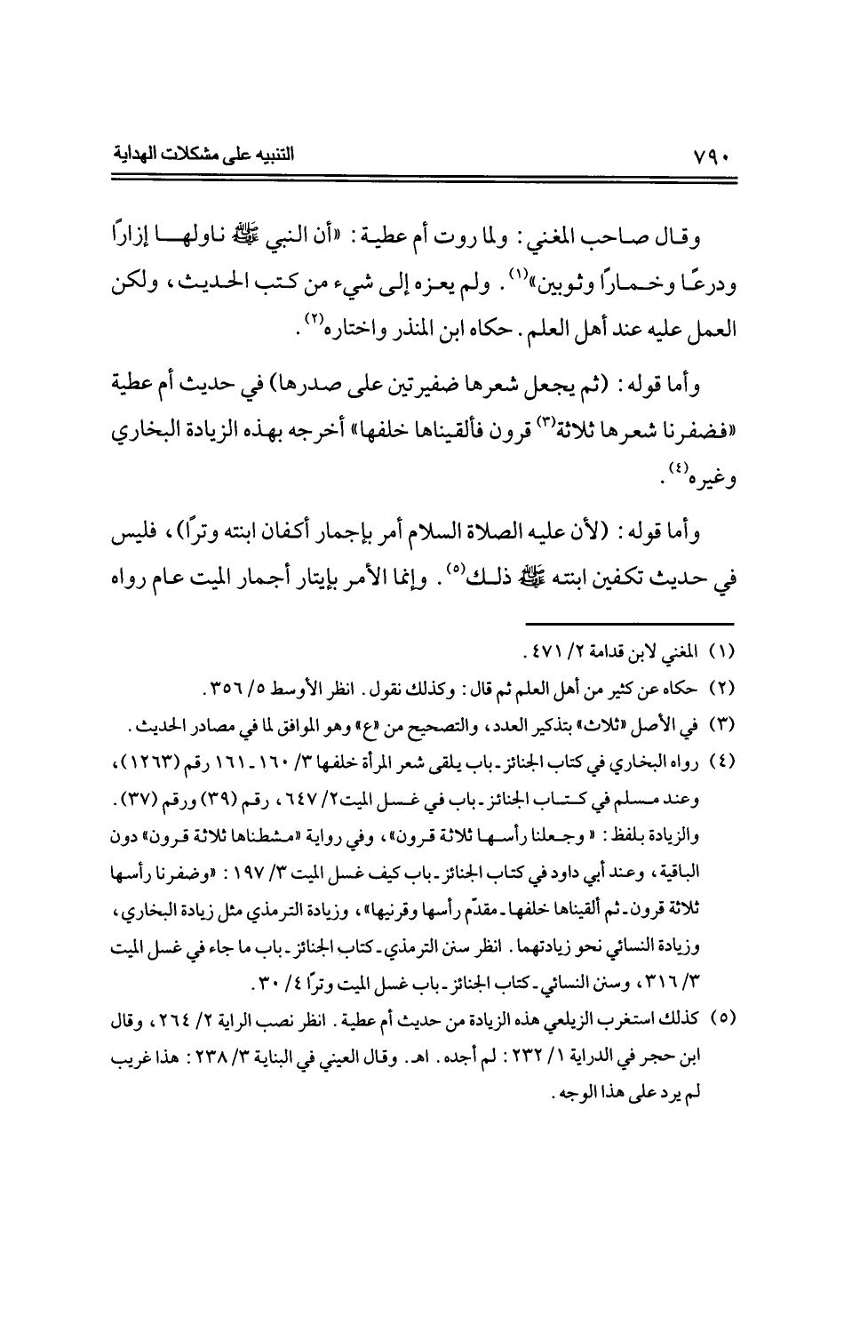 وأما قوله: (لأن -عليه الصلاة والسلام- أمر بإجمار أكفان ابنته وترًا)، فليس في حديث تكفين ابنته -صلى الله عليه وسلم- ذلك. وإنما الأمر بإيتار أجمار الميت عام رواه