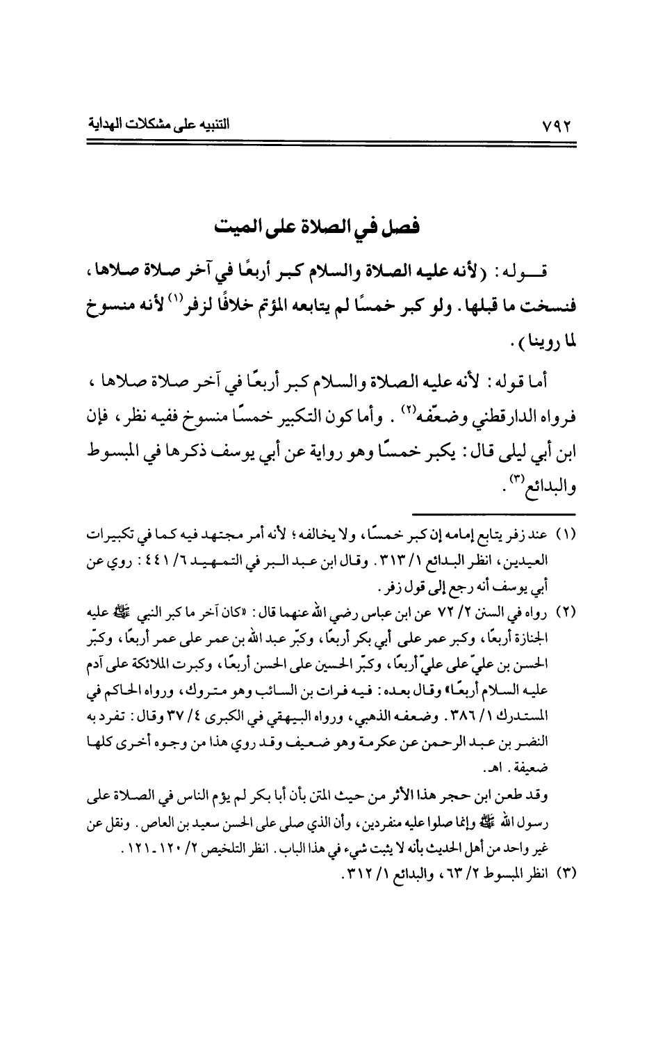 أما قوله: لأنه -عليه الصلاة والسلام- كبر أربعًا في آخر صلاة صلاها، فرواه الدارقطني وضعفه. وأما كون التكبير خمسًا منسوخ ففيه نظر، فإن ابن أبي ليلى قال: يكبر خمسًا وهو رواية عن أبي يوسف ذكرها في المبسوط والبدائع.