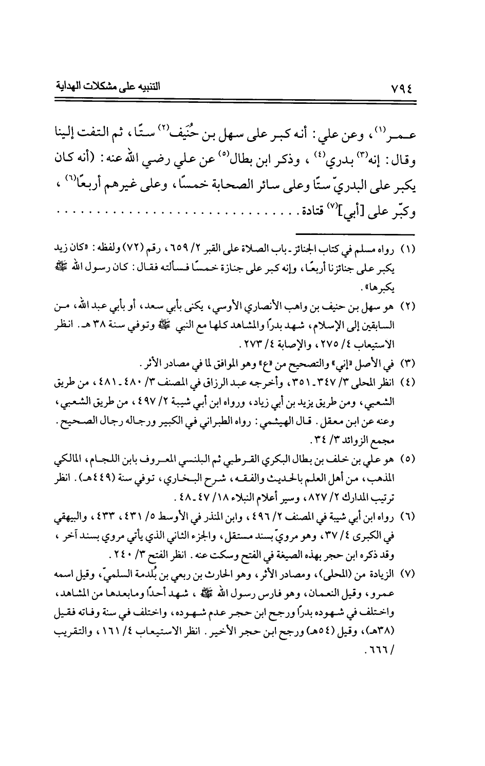 عمر، وعن علي: أنه كبر على سهل بن حُنَيف ستًا، ثم التفت إلينا وقال: إنه بدري، وذكر ابن بطال عن علي -رضي الله عنه-: (أنه كان يكبر على البدريّ ستًا وعلى سائر الصحابة خمسًا، وعلى غيرهم أربعًا، وكبّر على [أبي] قتادة ..................................