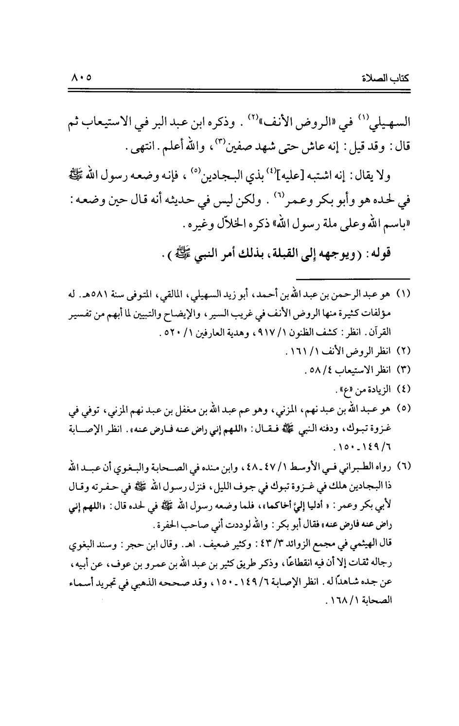ولا يقال: إنه اشتبه [عليه] بذي البجادين، فإنه وضعه رسول الله -صلى الله عليه وسلم- في لحده هو وأبو بكر وعمر. ولكن ليس في حديثه أنه قال حين وضعه: "باسم الله وعلى ملة رسول الله" ذكره الخلال وغيره.