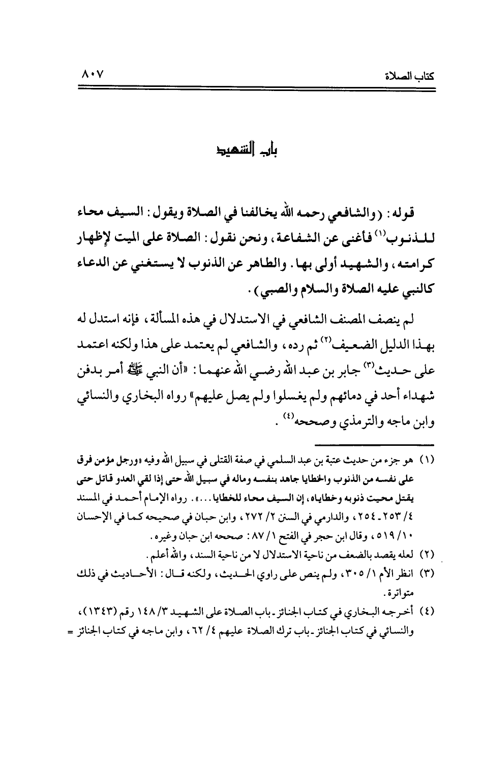 لم ينصف المصنف الشافعي في الاستدلال في هذه المسألة، فإنه استدل له بهذا الدليل الضعيف ثم رده، والشافعي لم يعتمد على هذا ولكنه اعتمد على حديث جابر بن عبد الله -رضي الله عنهما-: "أن النبي -صلى الله عليه وسلم- أمر بدفن شهداء أحد في دمائهم ولم يغسلوا ولم يصل عليهم" رواه البخاري والنسائي وابن ماجه والترمذي وصححه.