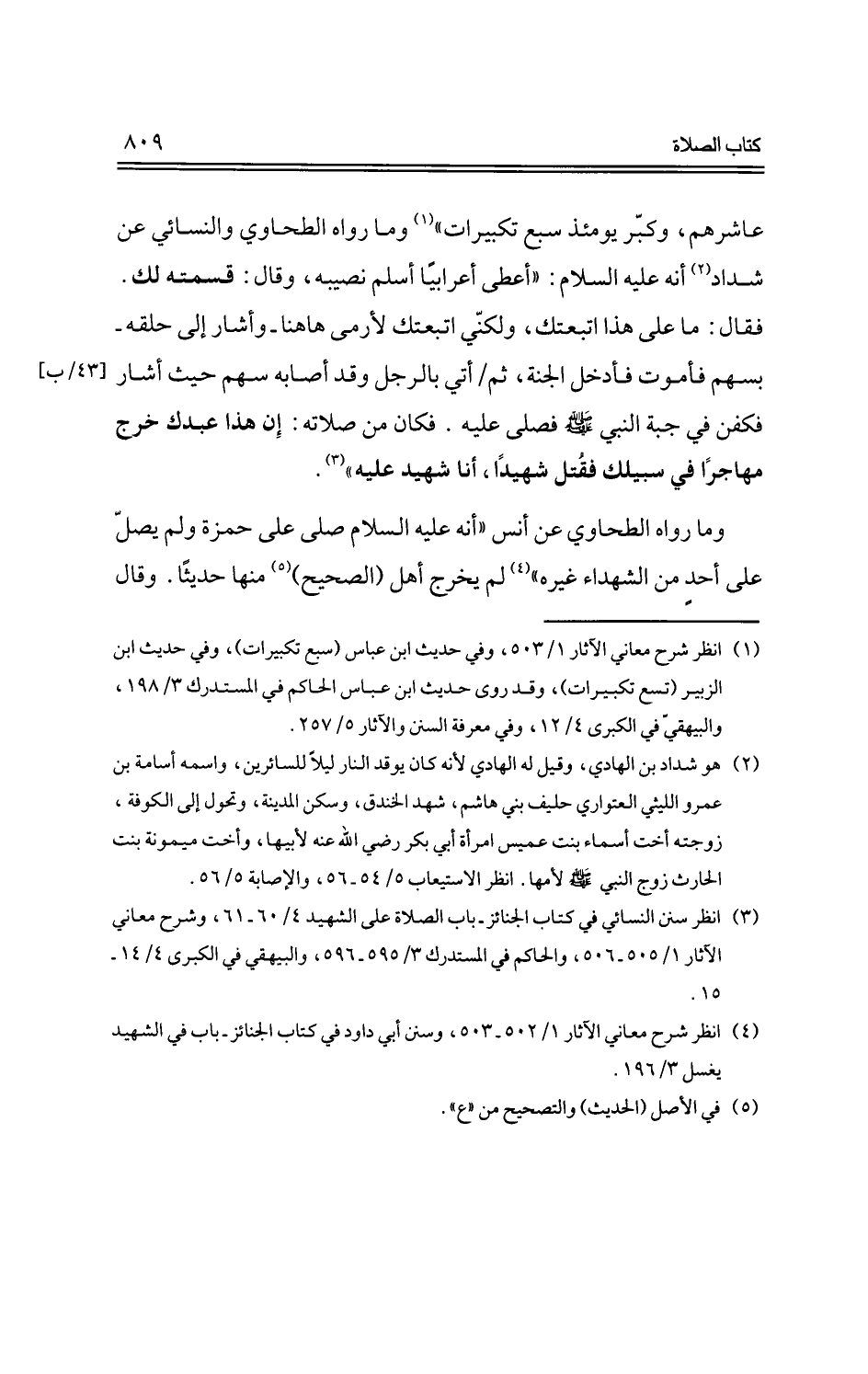 عاشرهم، وكبر يومئذ سبع تكبيرات" وما رواه الطحاوي والنسائي عن شداد أنه -عليه السلام-: "أعطى أعرابيًا أسلم نصيبه، وقال: قسمته لك. فقال: ما على هذا اتبعتك، ولكني اتبعتك لأرمى ها هنا -وأشار إلى حلقه- بسهم فأموت فأدخل الجنة، ثم أتي بالرجل وقد أصابه سهم حيث أشار فكفن في جبة النبي -صلى الله عليه وسلم- فصلى عليه. فكان من صلاته: إن هذا عبدك خرج مهاجرًا في سبيلك فقتل شهيدًا، أنا شهيد عليه".