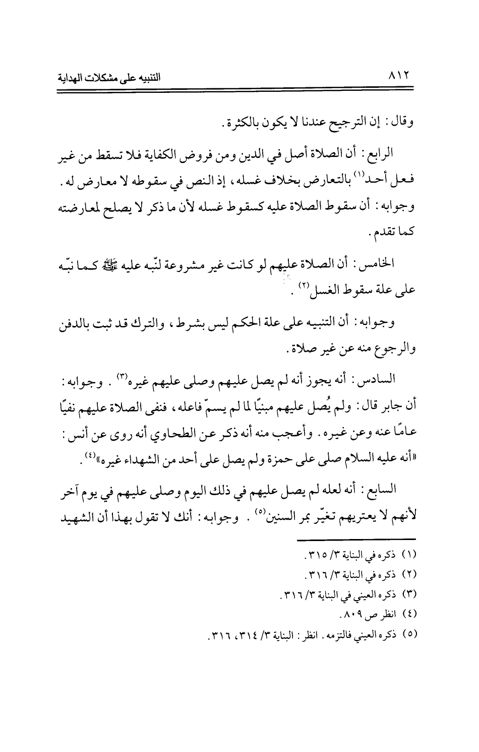 السادس: أنه يجوز أنه لم يصل عليهم وصلى على غيره. وجوابه: أن جابر قال: ولم يصل عليهم مبنيًا لما لم يسم فاعله، فنفي الصلاة عليهم نفيًا عامًا عنه وعن غيره. وأعجب منه أنه ذكر عن الطحاوي أنه روى عن أنس: "أنه -عليه السلام- صلى على حمزة ولم يصل على أحد من الشهداء غيره".