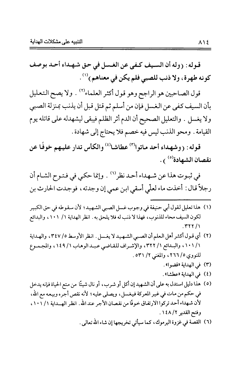 قول الصاحبين هو الراجح وهو قول أكثر العلماء. ولا يصح التعليل بأن السيف كفى عن الغسل فإن من أسلم ثم قتل قبل أن يذنب بمنزلة الصبي ولا يغسل. والتعليل الصحيح أن الدم أثر الظلم فيبقى ليشهد له على قاتله يوم القيامة. ومحو الذنب ليس فيه خصم فلا يحتاج إلى شهادة.
