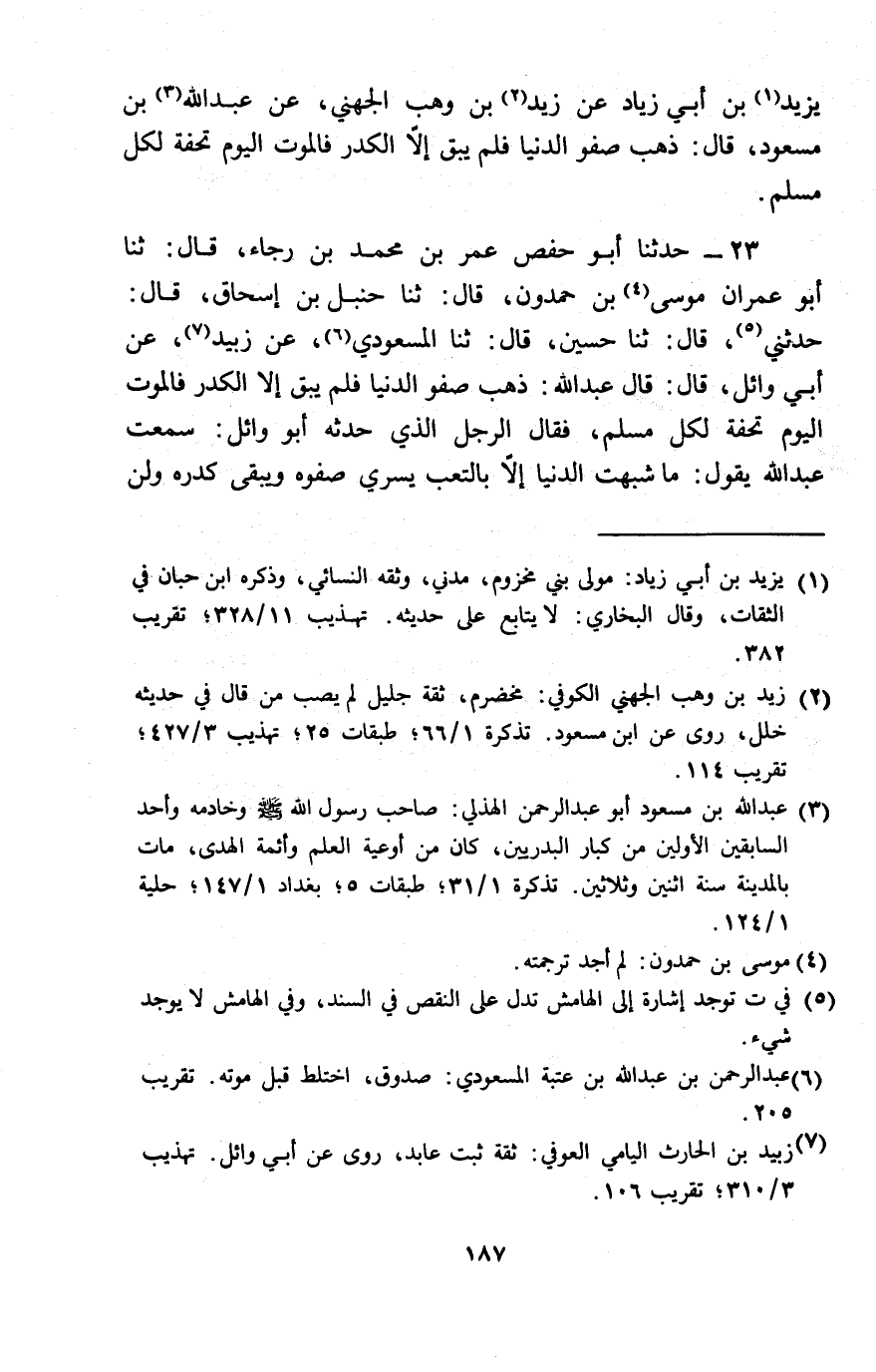 23 - حَدَّثَنَا أَبُو حَفْصٍ عُمَرُ بْنُ مُحَمَّدِ بْنِ رَجَاءٍ، قَالَ: ثنا أَبُو عِمْرَانَ مُوسَى بْنُ حَمْدُونٍ، قَالَ: ثنا حَنْبَلُ بْنُ إِسْحَاقَ، قَالَ: حَدَّثَنِي. . . قَالَ: ثنا حُسَيْنٌ، قَالَ: ثنا الْمَسْعُودِيُّ، عَنْ زُبَيْدٍ، عَنْ أَبِي وَائِلٍ، قَالَ: قَالَ عَبْدُ اللَّهِ: «§ذَهَبَ صَفْوُ الدُّنْيَا، فَلَمْ يَبْقَ إِلَّا الْكَدَرُ، فَالْمَوْتُ الْيَوْمَ تُحْفَةٌ لِكُلِّ مُسْلِمٍ»