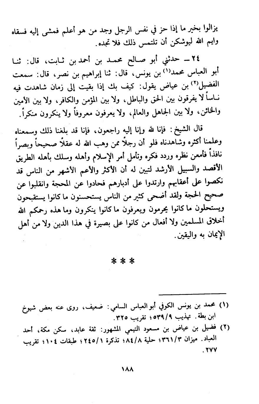 24 - حَدَّثَنِي أَبُو صَالِحٍ مُحَمَّدُ بْنُ أَحْمَدَ بْنِ ثَابِتٍ، قَالَ: ثنا أَبُو الْعَبَّاسِ مُحَمَّدُ بْنُ يُونُسَ، قَالَ: ثنا إِبْرَاهِيمُ بْنُ نَصْرٍ، قَالَ: سَمِعْتُ الْفُضَيْلَ بْنَ عِيَاضٍ، يَقُولُ: § «كَيْفَ بِكَ إِذَا بَقِيتَ إِلَى زَمَانٍ شَاهَدْتَ فِيهِ نَاسًا لَا يُفَرِّقُونَ بَيْنَ الْحَقِّ وَالْبَاطِلِ، وَلَا بَيْنَ الْمُؤْمِنِ وَالْكَافِرِ، وَلَا بَيْنَ الْأَمِينِ وَالْخَائِنِ، وَلَا بَيْنَ الْجَاهِلِ وَالْعَالِمِ، وَلَا يَعْرِفُونَ مَعْرُوفًا، وَلَا يُنْكِرُونَ مُنْكَرًا؟» قَالَ الشَّيْخُ: " فَإِنَّا لِلَّهِ وَإِنَّا إِلَيْهِ رَاجِعُونَ، فَإِنَّا قَدْ بَلَغَنَا ذَلِكَ، وَسَمِعْنَاهُ، وَعَلِمْنَا أَكْثَرَهُ، وَشَاهَدْنَاهُ، فَلَوْ أَنَّ رَجُلًا مِمَّنْ وَهَبَ اللَّهُ لَهُ عَقْلًا صَحِيحًا، وَبَصَرًا نَافِذًا، فَأَمْعَنَ نَظَرَهُ وَرَدَّدَ فِكْرَهُ، وَتَأَمَّلَ أَمْرَ الْإِسْلَامِ وَأَهْلَهُ، وَسَلَكَ بِأَهْلِهِ الطَّرِيقَ الْأَقْصَدَ، وَالسَّبِيلَ الْأَرْشَدَ لَتَبَيَّنَ لَهُ أَنَّ الْأَكْثَرَ وَالْأَعَمَّ الْأَشْهَرَ مِنَ النَّاسِ قَدْ نَكَصُوا عَلَى أَعْقَابِهِمْ، وَارْتَدُّوا عَلَى أَدْبَارِهِمْ، فَحَادُوا عَنِ الْمَحَجَّةِ، وَانْقَلَبُوا عَنْ صَحِيحِ الْحُجَّةِ، وَلَقَدْ أَضْحَى كَثِيرٌ مِنَ النَّاسِ يَسْتَحْسِنُونَ مَا كَانُوا يَسْتَقْبِحُونَ، وَيَسْتَحِلُّونَ مَا كَانُوا يُحَرِّمُونَ، وَيَعْرِفُونَ مَا كَانُوا يُنْكِرُونَ، وَمَا هَذِهِ رَحِمَكُمُ اللَّهُ أَخْلَاقَ الْمُسْلِمِينَ، وَلَا أَفْعَالَ مَنْ كَانُوا عَلَى بَصِيرَةٍ فِي هَذَا الدِّينِ، وَلَا مِنْ أَهْلِ الْإِيمَانِ بِهِ وَالْيَقِينِ