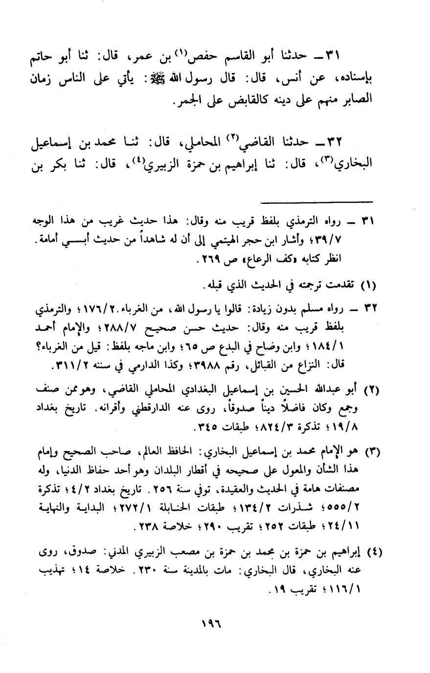 32 - حَدَّثَنَا الْقَاضِي الْمَحَامِلِيُّ، قَالَ: ثنا مُحَمَّدُ بْنُ إِسْمَاعِيلَ الْبُخَارِيُّ، قَالَ: ثنا إِبْرَاهِيمُ بْنُ حَمْزَةَ الزُّبَيْرِيُّ، قَالَ: ثنا بَكْرُ بْنُ -[197]- سُلَيْمٍ الصَّوَّافُ، عَنْ أَبِي حَازِمٍ، عَنْ أَبِي هُرَيْرَةَ، عَنِ النَّبِيِّ صَلَّى اللَّهُ عَلَيْهِ وَسَلَّمَ قَالَ: «§بَدَأَ الْإِسْلَامُ غَرِيبًا، وَسَيَعُودُ غَرِيبًا كَمَا بَدَأَ، فَطُوبَى لِلْغُرَبَاءِ»، قِيلَ: يَا رَسُولَ اللَّهِ، وَمَنِ الْغُرَبَاءُ؟ قَالَ: «الَّذِينَ يُصْلِحُونَ عِنْدَ فَسَادِ النَّاسِ» قَالَ الشَّيْخُ: «جَعَلَنَا اللَّهُ وَإِيَّاكُمْ بِكِتَابِ اللَّهِ عَامِلِينَ، وَبِسُنَّةِ نَبِيِّنَا صَلَّى اللَّهُ عَلَيْهِ وَسَلَّمَ مُتَمَسِّكِينَ، وَلِلْأَئِمَّةِ الْخُلَفَاءِ الرَّاشِدِينَ الْمَهْدِيِّينَ مُتَّبِعِينَ، وَلِآثَارِ سَلَفِنَا، وَعُلَمَائِنَا مُقْتَفِينَ، وَبِهَدْيِ شُيُوخِنَا الصَّالِحِينَ رَحْمَةُ اللَّهِ عَلَيْهِمْ أَجْمَعِينَ مُهْتَدِينَ، فَإِنَّ اللَّهَ جَلَّ ثَنَاؤُهُ، وَتَقَدَّسَتْ أَسْمَاؤُهُ قَدْ جَعَلَ فِي كُلِّ زَمَانٍ فَتْرَةً مِنَ الرُّسُلِ، وَدُرُوسًا لِلْأَثَرِ بِمَ هُوَ تَعَالَى بِلُطْفِهِ بِعِبَادِهِ، وَرِفْقِهِ بِأَهْلِ عِنَايَتِهِ، وَمَنْ سَبَقَتْ لَهُ الرَّحْمَةُ فِي كِتَابِهِ لَا يُخَلِّي كُلَّ زَمَانٍ مِنْ بَقَايَا مِنْ أَهْلِ الْعِلْمِ، وَحَمَلَةِ الْحُجَّةِ يَدْعُونَ مَنْ ضَلَّ إِلَى الْهُدَى، وَيَذُودُونَهُمْ عَنِ الرَّدَى يَصْبِرُونَ مِنْهُمْ عَلَى الْأَذَى، وَيُحْيُونَ بِكِتَابِ اللَّهِ الْمَوْتَى، وَيُبَصِّرُونَ بِعَوْنِ اللَّهِ أَهْلَ الْعَمَى، وَبِسُنَّةِ رَسُولِ اللَّهِ صَلَّى اللَّهُ عَلَيْهِ وَسَلَّمَ أَهْلَ الْجَهَالَةِ وَالْغَبَا»