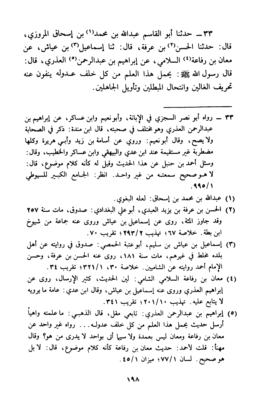 33 - حَدَّثَنَا أَبُو الْقَاسِمِ عَبْدُ اللَّهِ بْنُ مُحَمَّدِ بْنِ إِسْحَاقَ الْمَرْوَزِيُّ، قَالَ: حَدَّثَنَا الْحَسَنُ بْنُ عَرَفَةَ، قَالَ: ثنا إِسْمَاعِيلُ بْنُ عَيَّاشٍ، عَنْ مُعَانِ بْنِ رِفَاعَةَ السَّلَامِيِّ، عَنْ إِبْرَاهِيمَ بْنِ عَبْدِ الرَّحْمَنِ الْعُذْرِيِّ، قَالَ: قَالَ رَسُولُ اللَّهِ صَلَّى اللَّهُ عَلَيْهِ وَسَلَّمَ: § «يَحْمِلُ هَذَا الْعِلْمَ مِنْ كُلِّ خَلَفٍ عُدُولُهُ يَنْفُونَ عَنْهُ تَحْرِيفَ الْغَالِينَ، وَانْتِحَالَ الْمُبْطِلِينَ، وَتَأْوِيلَ الْجَاهِلِينَ»