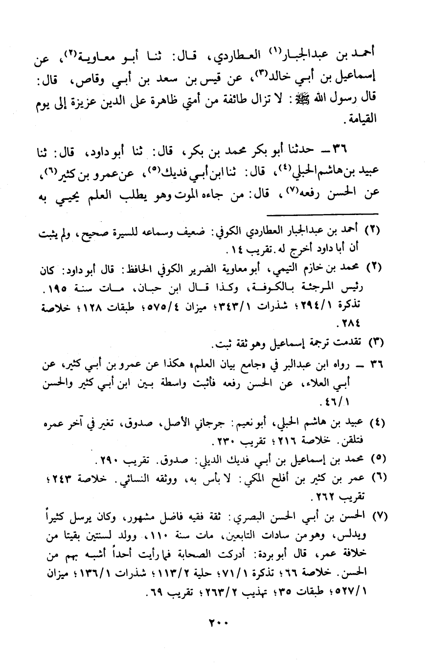 36 - حَدَّثَنَا أَبُو بَكْرٍ مُحَمَّدُ بْنُ بَكْرٍ، قَالَ: ثنا أَبُو دَاوُدَ، قَالَ: ثنا عُبَيْدُ بْنُ هَاشِمٍ الْحُبُلِيُّ، قَالَ: ثنا ابْنُ أَبِي فُدَيْكٍ، عَنْ عَمْرِو بْنِ كَثِيرٍ، عَنِ الْحَسَنِ، رَفَعَهُ قَالَ: «§مَنْ جَاءَهُ الْمَوْتُ، وَهُوَ يَطْلُبُ الْعِلْمَ يُحْيِي بِهِ -[201]- الْإِسْلَامَ لَمْ يَكُنْ بَيْنَهُ وَبَيْنَ الْأَنْبِيَاءِ فِي الْجَنَّةِ إِلَّا دَرَجَةٌ»