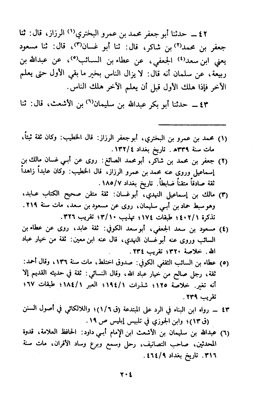 43 - حَدَّثَنَا أَبُو بَكْرٍ عَبْدُ اللَّهِ بْنُ سُلَيْمَانَ بْنِ الْأَشْعَثِ، قَالَ: ثنا -[205]- أَبُو عُمَيْرٍ النَّحَّاسُ، قَالَ: ثنا ضَمْرَةُ، عَنِ ابْنِ شَوْذَبٍ، قَالَ: " إِنَّ مِنْ نِعْمَةِ اللَّهِ عَلَى الشَّابِّ §إِذَا تَنَسَّكَ أَنْ يُوَاخِيَ صَاحِبَ سُنَّةٍ يَحْمِلُهُ عَلَيْهَا. وَعَنْهُ مِنْ طَرِيقٍ: مِنْ نِعْمَةِ اللَّهِ عَلَى الشَّابِّ وَالْأَعْجَمِيِّ إِذَا نَسَكَا أَنْ يُوَفَّقَا لِصَاحِبِ سُنَّةٍ يَحْمِلُهُمَا عَلَيْهَا، لِأَنَّ الْأَعْجَمِيَّ يَأْخُذُ فِيهِ مَا سَبَقَ إِلَيْهِ "